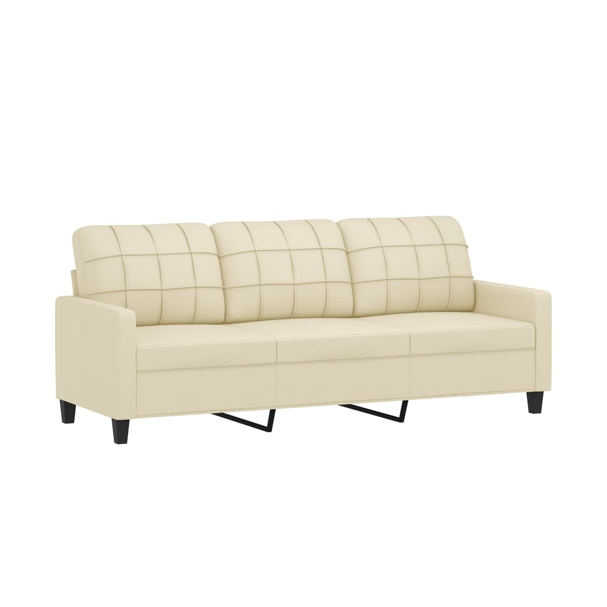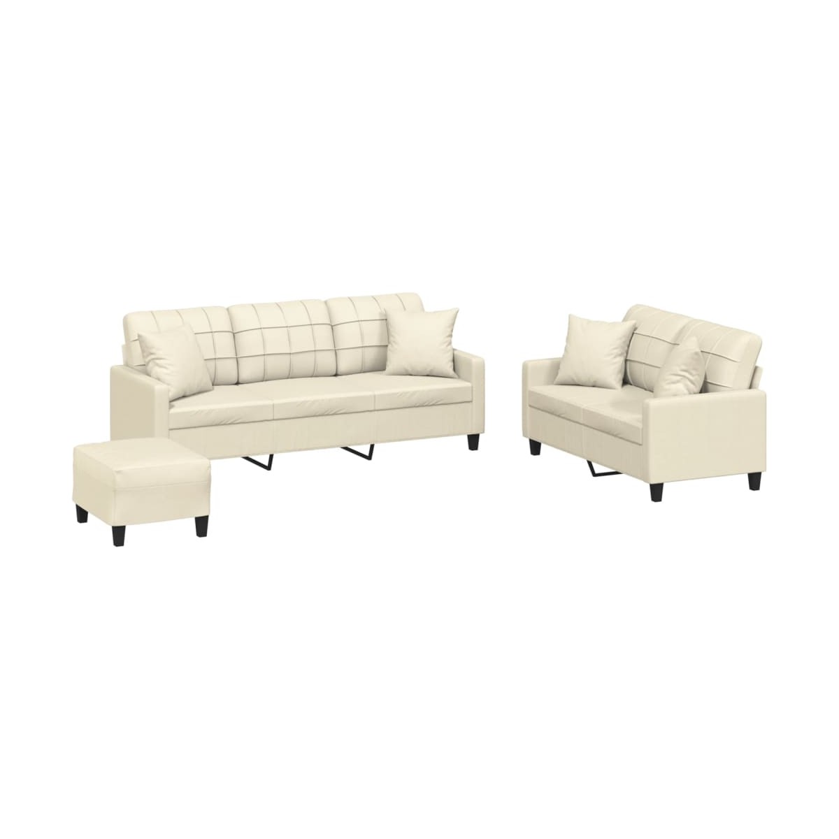 Este juego de sofás es un lugar excelente para charlar, leer, ver la televisión o simplemente relajarse. Está pensado para ser el centro de atención de la casa. Material duradero: El cuero sintético de primera calidad es un material muy duradero. Es resistente a las manchas, por lo que es fácil de limpiar con un paño húmedo. Además, la superficie lisa da un aspecto lujoso y la belleza del cuero auténtico.Estructura robusta y estable: La estructura de madera contrachapada y metal del sofá garantiza su solidez y estabilidad.Cómodo asiento: El sofá es muy cómodo gracias al asiento con relleno, los reposabrazos y la almohada trasera.Prácticos cojines para el sofá: Estos cojines cuadrados no sólo adornan la decoración, sino que también añaden comodidad cuando estás sentado o tumbado.Taburete versátil: El reposapiés va genial para descansar los pies cuando te recuestas en el sofá y también sirve como asiento extra en la estancia. Además, el diseño sencillo y el tamaño compacto lo hacen ideal para casi todos los espacios de la casa.
