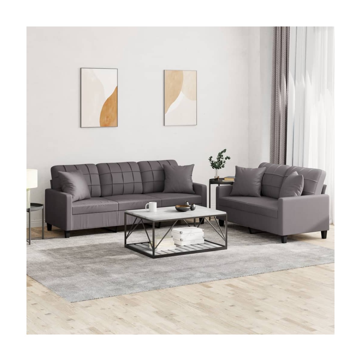 Este juego de sofás es un lugar excelente para charlar, leer, ver la televisión o simplemente relajarse. Está pensado para ser el centro de atención de la casa. Material duradero: El cuero sintético de primera calidad es un material muy duradero. Es resistente a las manchas, por lo que es fácil de limpiar con un paño húmedo. Además, la superficie lisa da un aspecto lujoso y la belleza del cuero auténtico.Estructura robusta y estable: La estructura de madera contrachapada y metal del sofá garantiza su solidez y estabilidad.Cómodo asiento: El sofá es muy cómodo gracias al asiento con relleno, los reposabrazos y la almohada trasera.Prácticos cojines para el sofá: Estos cojines cuadrados no sólo adornan la decoración, sino que también añaden comodidad cuando estás sentado o tumbado.