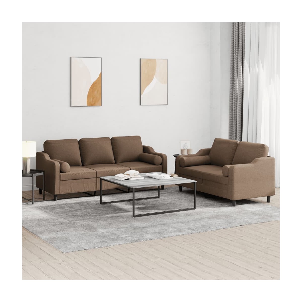 Este juego de sofás es un lugar excelente para charlar, leer, ver la televisión o simplemente relajarse. Está pensado para ser el centro de atención de la casa. Tela duradera: La tela posee un aspecto sencillo y limpio, además de ser transpirable y duradera.Estructura robusta y estable: La estructura de madera contrachapada y metal del sofá garantiza su solidez y estabilidad. Cómodo asiento: El sofá es muy cómodo gracias al asiento con relleno, los reposabrazos y la almohada trasera. Prácticas almohadas cilíndricas: Estas almohadas cilíndricas no sólo adornan la decoración, sino que también pueden añadir un plus de comodidad cuando estás sentado o tumbado.