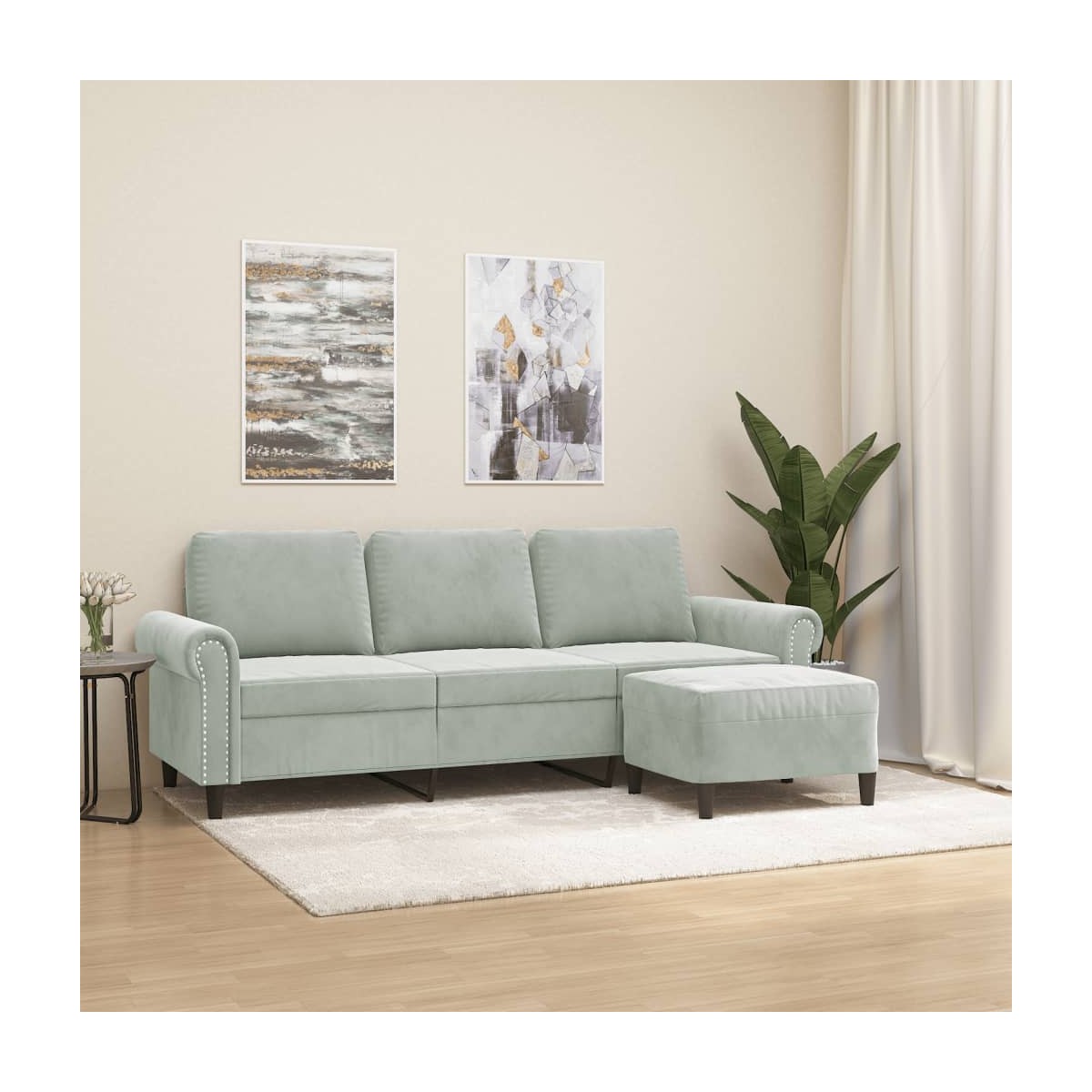 Este sofá de 3 plazas con taburete es un lugar excelente para charlar, leer, ver la televisión o simplemente relajarte. Está pensado para ser el centro de atención de la casa. Terciopelo duradero: El terciopelo es una tela suave y cálida, agradable al tacto.Estructura robusta y estable: La estructura de madera contrachapada y metal del sofá con reposapiés garantiza su solidez y estabilidad.Asiento cómodo: El sillón resulta muy cómodo gracias a los gruesos acolchados de los asientos, los reposabrazos y las almohadas del respaldo.Taburete versátil: El taburete es adecuado para descansar los pies cuando te recuestas en el sofá o sillón reclinable, y te ofrece un asiento adicional en la estancia. Además, el diseño sencillo y el tamaño compacto lo hacen ideal para casi todos los espacios de tu hogar.Diseño llamativo: Con un diseño sencillo a la par que moderno, este sillón con taburete está pensado para llamar la atención en la estancia.