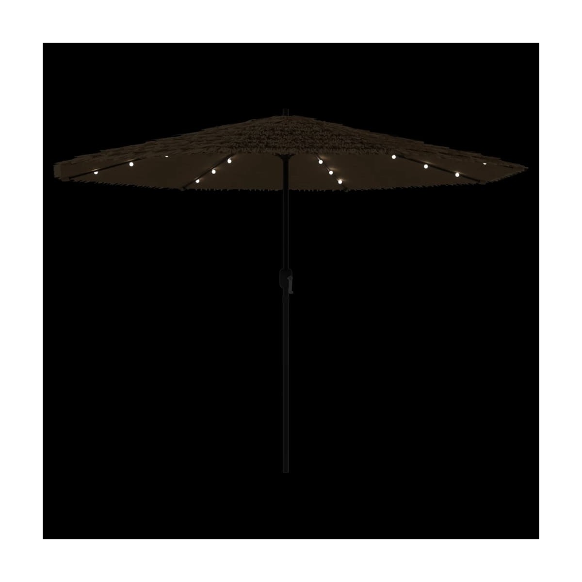 Esta sombrilla de jardín con LED es perfecta para crear algo de sombra y protegerte de los dañinos rayos UV del sol. Protección contra el sol y la lluvia: Hecha de poliéster duradero, esta sombrilla ofrece protección contra el sol y la lluvia, creando un lugar ideal para disfrutar del aire libre.Construcción robusta: Esta sombrilla de jardín está sostenida por un poste robusto y varillas en la parte superior, lo que garantiza que la cubierta permanezca en posición vertical incluso en días ventosos.Mecanismo de manivela: Gracias al mecanismo de manivela, la sombrilla puede abrirse y cerrarse fácilmente.Luces LED brillantes: Las luces LED integradas de la sombrilla iluminan tu espacio al aire libre y crean un ambiente acogedor y romántico cuando se pone el sol. Información útil:¡Este producto no es un juguete! Asegúrate de que los niños no usen ni la sombrilla, ni el toldo, ni la base para jugar o trepar.No utilices fuego abierto (p. ej. barbacoa o parrilla de jardín) debajo o justo al lado de este producto.Este producto no es 100% impermeable. Recomendamos tratar este producto con un spray impermeable para una mejor resistencia al agua.