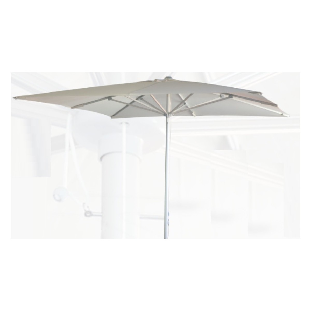 Parasol modelo Salomón, fabricado con montura y varillas de aluminio y con un sistema de apertura de doble polea. El mástil blanco es de 48 mm en una sola pieza y el tejido de polyester 270 gr/m2 con tratamiento hidrófugo.