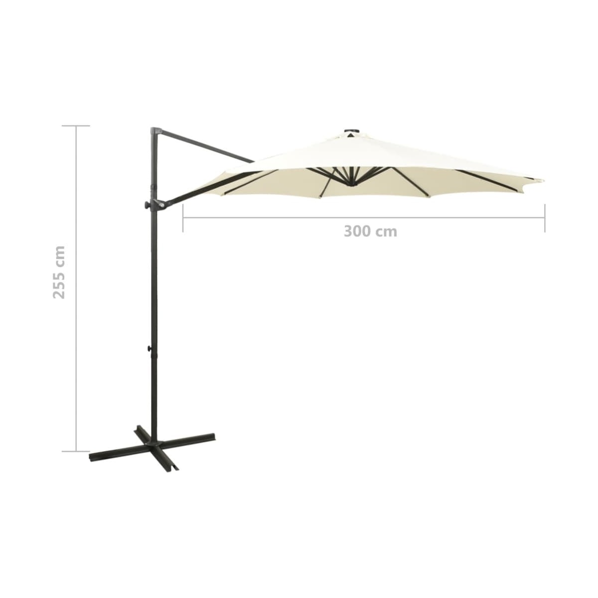 Esta sombrilla voladiza con luces LED es una excelente opción para crear algo de sombra y protección contra los dañinos rayos UVA del sol. La cubierta de la sombrilla, fabricada en poliéster protector UVA y anti-decoloración, proporciona una protección óptima contra el sol y es fácil de limpiar. Cuenta con una base cruzada robusta para mayor estabilidad. El diseño exclusivo de la sombrilla de jardín te permite inclinarla y girarla 360 grados para bloquear el sol desde cualquier ángulo. El fuerte poste de aluminio, junto con las 8 varillas, hace que la sombrilla sea muy estable y duradera. Esta sombrilla de jardín se puede abrir y cerrar fácilmente gracias al mecanismo del manivela. Además, esta sombrilla de patio cuenta con 24 LED para iluminar tu jardín y crear un ambiente acogedor y romántico cuando se pone el sol. Ten en cuenta que recomendamos tratar la tela de la sombrilla con un aerosol impermeabilizante si se ve sometida a fuertes lluvias.