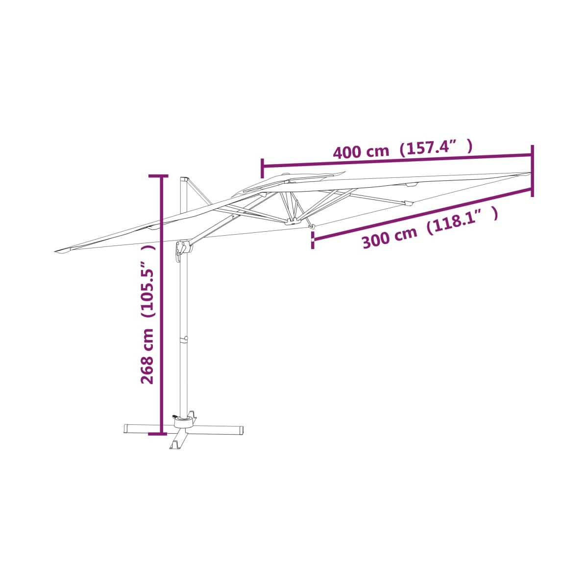 Esta elegante sombrilla colgante de doble techo es una elección perfecta para crear un poco de sombra y protegerte de los nocivos rayos UV del sol. Material duradero: El poliéster es un material sintético conocido por su resistencia a los rayos UV y su resistencia elástica. El poliéster con un revestimiento de PA es resistente al agua, por lo que resulta la elección perfecta para condiciones húmedas o lluviosas, además de limpiarse fácilmente.Estructura robusta: El fuerte poste de aluminio con recubrimiento en polvo, junto con 15 varillas duraderas, hacen que este parasol sea muy estable y duradero. La sombrilla de exterior también cuenta con una robusta base en cruz para añadir estabilidad.Diseño inclinable y giratorio de 360 grados: Ajuste la posición del toldo con el mecanismo de inclinación para mantener la zona exterior fresca y cómoda durante todo el día. También puedes girar la sombrilla 360 grados de forma horizontal con tan solo pisar el pedal y girar el poste.Diseño de doble techo: El diseño de doble techo permite suficiente ventilación y flujo de aire, lo que hace que la sombrilla de patio sea más estable frente al viento y mantiene el frescor debajo de ella.Sistema de manivela: El mecanismo de manivela permite abrir y cerrar la sombrilla de jardín sin esfuerzo. Nota:Este producto no es 100% impermeable. Por lo tanto, recomendamos tratarlo con un spray impermeable para una mejor impermeabilización.Cada producto viene con un manual de montaje en la caja para facilitar el montaje.