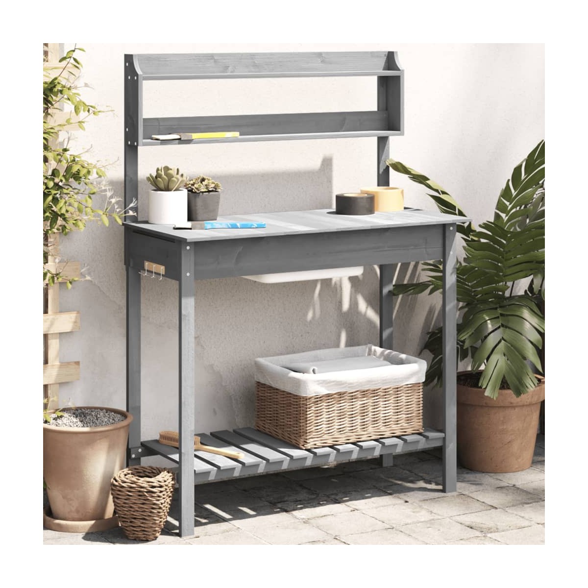 Esta mesa de madera para plantas es perfecta para organizar y exponer las macetas en casa, en un jardín, en un patio o en una terraza. Madera maciza de abeto: La mesa de banco para macetas está hecha de madera maciza de abeto para mayor robustez y estabilidad. La madera maciza de abeto es un material bonito y duradero que mantiene su integridad incluso cuando se expone a la humedad. No se seca ni se deforma, lo que la convierte en una opción fiable.Espacio de almacenamiento versátil: El banco de trabajo para macetas con 2 rieles superiores, un estante inferior y ganchos metálicos en el lateral proporciona suficiente espacio para productos relacionados, como pequeñas herramientas de jardinería, tierra, fertilizantes, etc.Diseño útil: La mesa de jardinería cuenta con una mesa expandible y un fregadero de plástico extraíble. Puedes acceder al fregadero en cualquier momento o cubrirlo y disfrutar de un espacio de trabajo resistente.Ventilado: Este estante inferior con diseño de lamas permite el flujo de agua, lo que hace que no se pudra fácilmente y garantiza una larga vida útil.Múltiples usos: La estación de macetas no solo puede aportar una sensación de naturaleza a tu hogar, sino que también puede ser un complemento perfecto para tu patio, jardín, invernadero, etc. Información útil:Para asegurarte de que tus muebles de exterior se mantengan hermosos, recomendamos protegerlos con una funda impermeable.