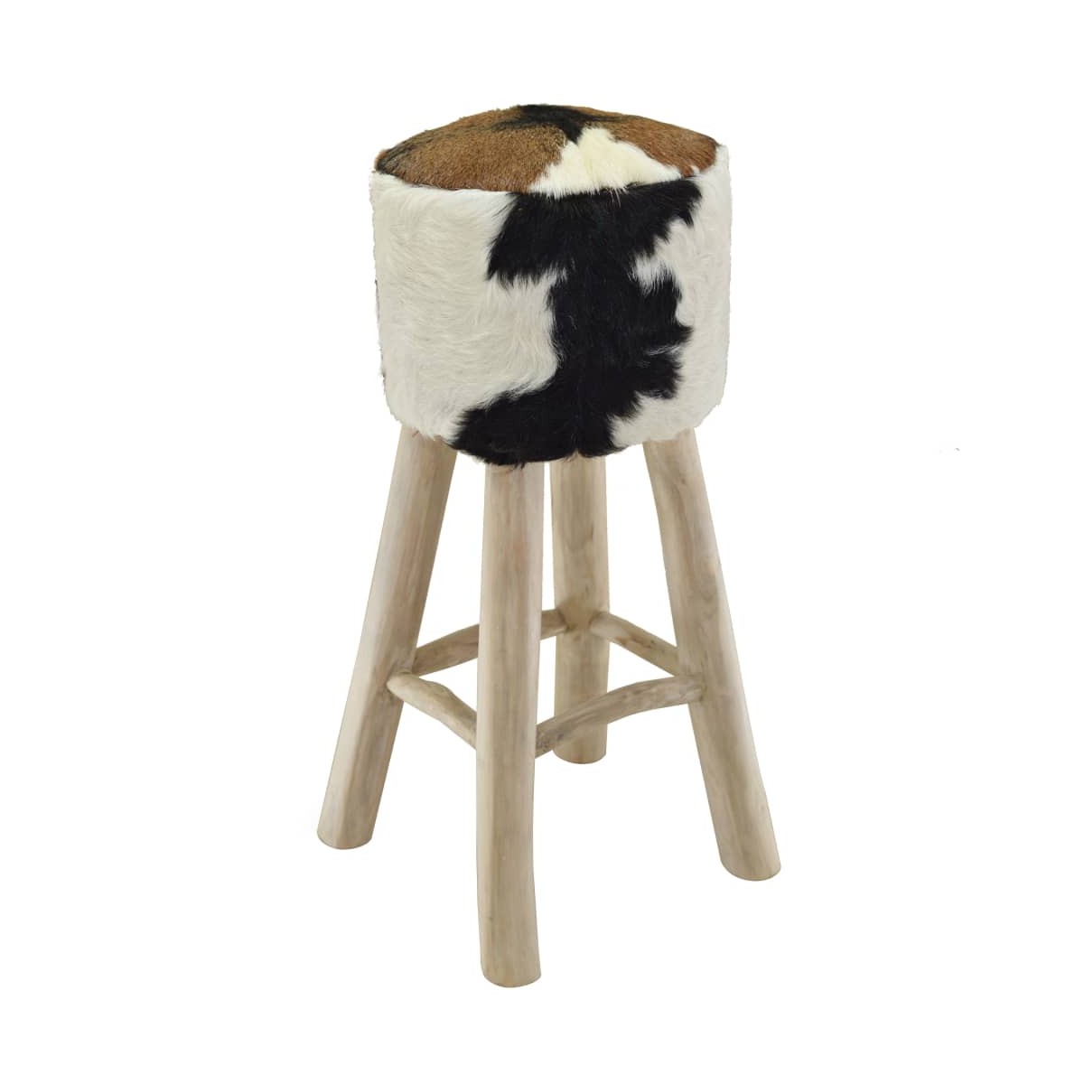 Este taburete de barra de cocina de auténtico cuero de cabra tiene un diseño único y llamativo y dará un toque de encanto rústico a restaurantes, bares y también al salón o comedor de su casa. El taburete de bar tiene una estructura maciza de teca, que hace que sea estable y resistente. El asiento está tapizado con cuero de cabra 100% auténtico, fuerte, duradero y flexible, y tiene un estampado de vaca. El cuero con pelo de cabra es suave al tacto y cómodo. El precioso estampado de piel natural hace que cada uno de nuestros taburetes sea único y ligeramente diferentes los unos de los otros. Gracias al mullido acolchado del asiento, podrá disfrutar de la máxima comodidad. Las patas, en color de madera natural, proporcionan al taburete un atractivo rústico. Nota: Los colores y estampados pueden variar de una pieza a otra. La entrega es aleatoria.