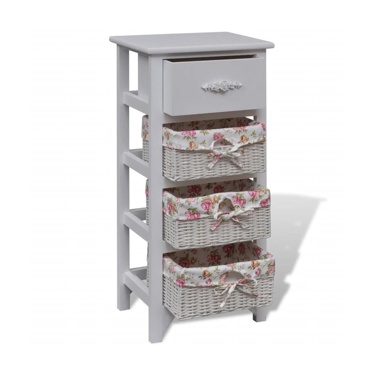 Esta estantería de madera, con un cajón y tres cestas está hecha de madera de alta calidad y tiene un diseño sencillo a la par que elegante. No solo sirve para guardar cosas, sino que también da un toque romántico a la decoración de la casa. Con un cajón y tres cestas, este duradero estante de madera tiene un amplio espacio para guardar tus objetos de valor. La estructura de madera tiene una superficie sobre la que puedes colocar elementos decorativos. Nuestro mueble de madera será el centro de atención de cualquier habitación. Advertencia: Para evitar que se vuelque, este producto debe usarse con el dispositivo de fijación a la pared provisto.