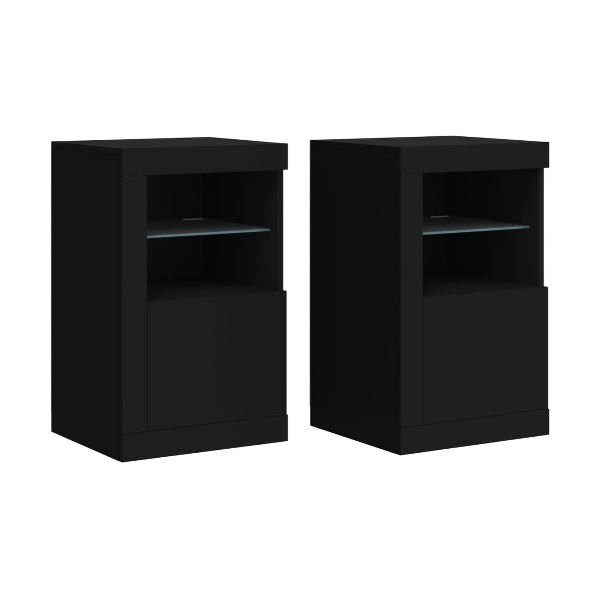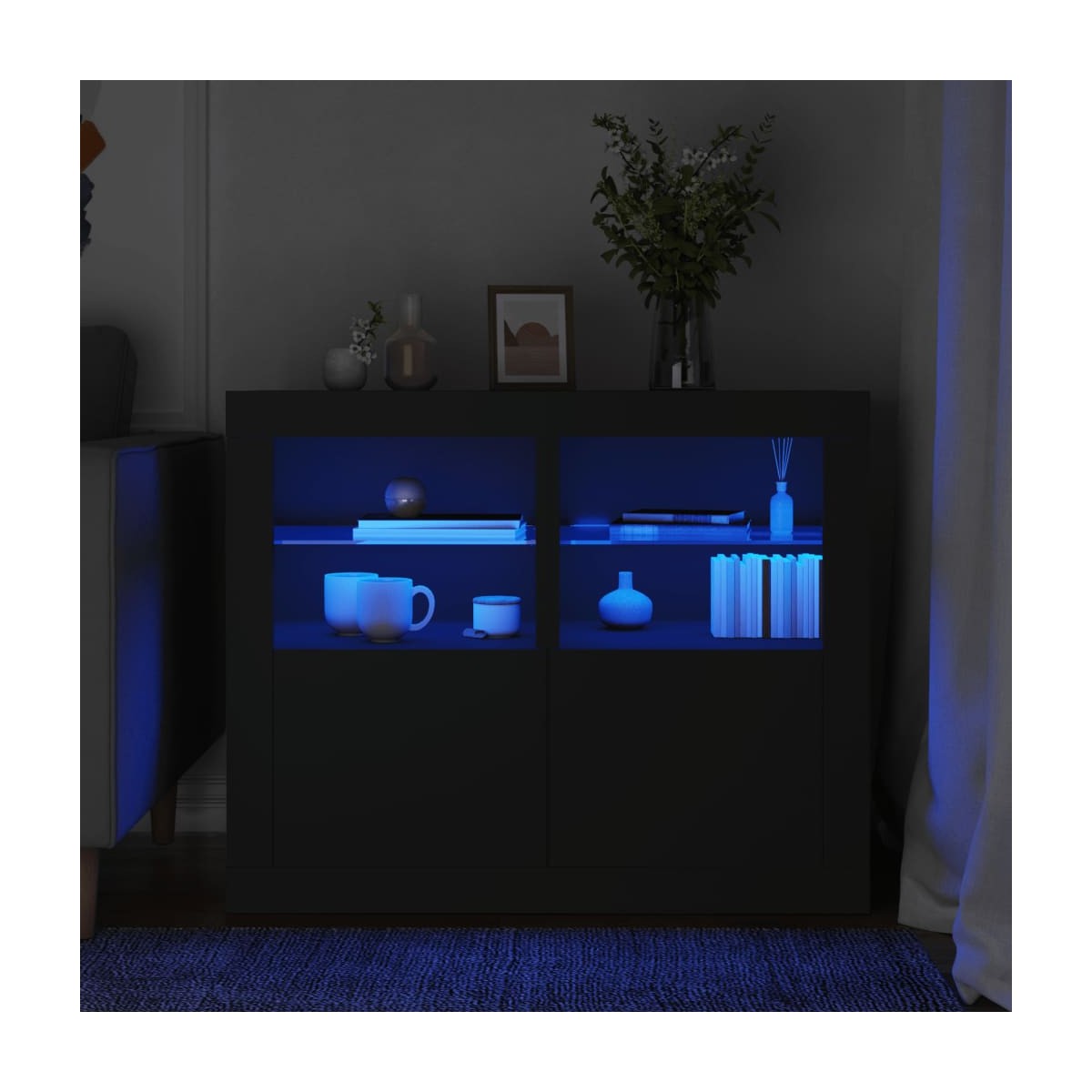 Con un diseño moderno pero práctico, estos muebles auxiliares con luces LED definitivamente se convertirá en el foco de atención de tu habitación. Material duradero: La madera de ingeniería tiene una calidad excepcional, con una superficie lisa y también cuenta con fuerza, estabilidad y resistencia a la humedad.Luces LED RGB: El armario está equipado con vibrantes luces LED RGB. Con varios menús personalizables, puedes cambiar sin esfuerzo el color de las luces e incluso hacer que se ajusten automáticamente. Estas luces LED no sólo realzan el look moderno del armario, sino que también le añaden un toque de moda.Amplio espacio de almacenamiento: el gabinete de almacenamiento cuenta con un estante de vidrio y un área de almacenamiento oculta detrás de sus puertas, lo que ofrece mucho espacio para mantener sus artículos cotidianos ordenados y fácilmente accesibles.Puerta flexible: Puedes instalar la puerta tanto en el lado izquierdo como en el derecho según lo que necesites. Información útil:El producto tiene un conector USB que necesita una fuente de alimentación USB certificada de 5 V (no incluida). Advertencia:Para evitar el vuelco, este producto debe usarse con el dispositivo provisto para fijarlo a la pared.