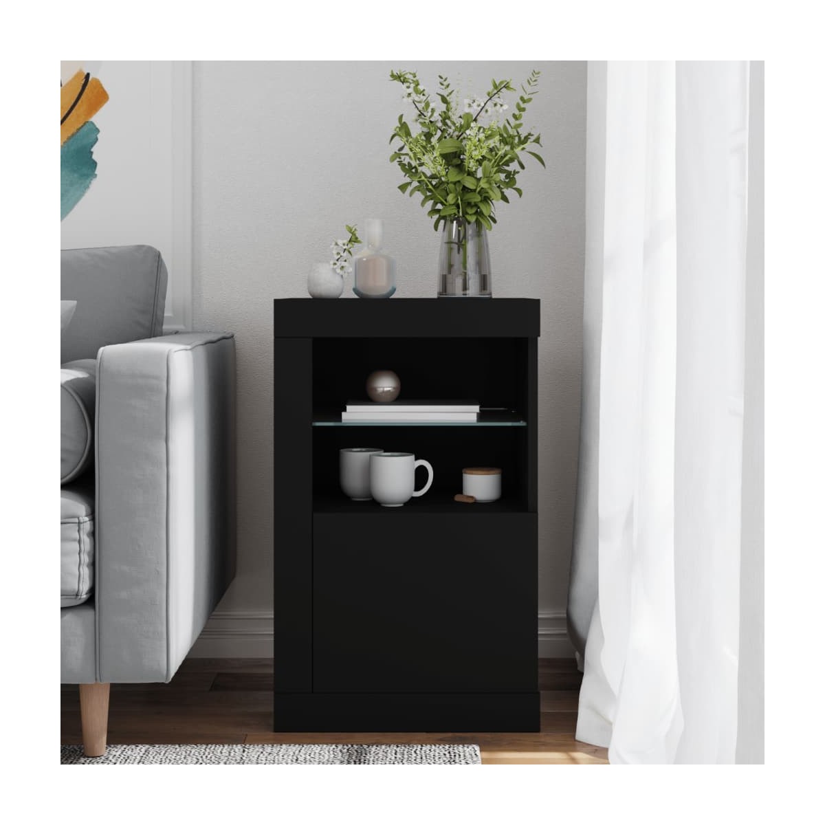 Con un diseño moderno pero práctico, este mueble auxiliar con luces LED definitivamente se convertirá en el foco de atención de tu habitación. Material duradero: La madera de ingeniería tiene una calidad excepcional, con una superficie lisa y también cuenta con fuerza, estabilidad y resistencia a la humedad.Luces LED RGB: El armario está equipado con vibrantes luces LED RGB. Con varios menús personalizables, puedes cambiar sin esfuerzo el color de las luces e incluso hacer que se ajusten automáticamente. Estas luces LED no sólo realzan el look moderno del armario, sino que también le añaden un toque de moda.Amplio espacio de almacenamiento: el gabinete de almacenamiento cuenta con un estante de vidrio y un área de almacenamiento oculta detrás de sus puertas, lo que ofrece mucho espacio para mantener sus artículos cotidianos ordenados y fácilmente accesibles.Puerta flexible: Puedes instalar la puerta tanto en el lado izquierdo como en el derecho según lo que necesites. Información útil:El producto tiene un conector USB que necesita una fuente de alimentación USB certificada de 5 V (no incluida). Advertencia:Para evitar el vuelco, este producto debe usarse con el dispositivo provisto para fijarlo a la pared.