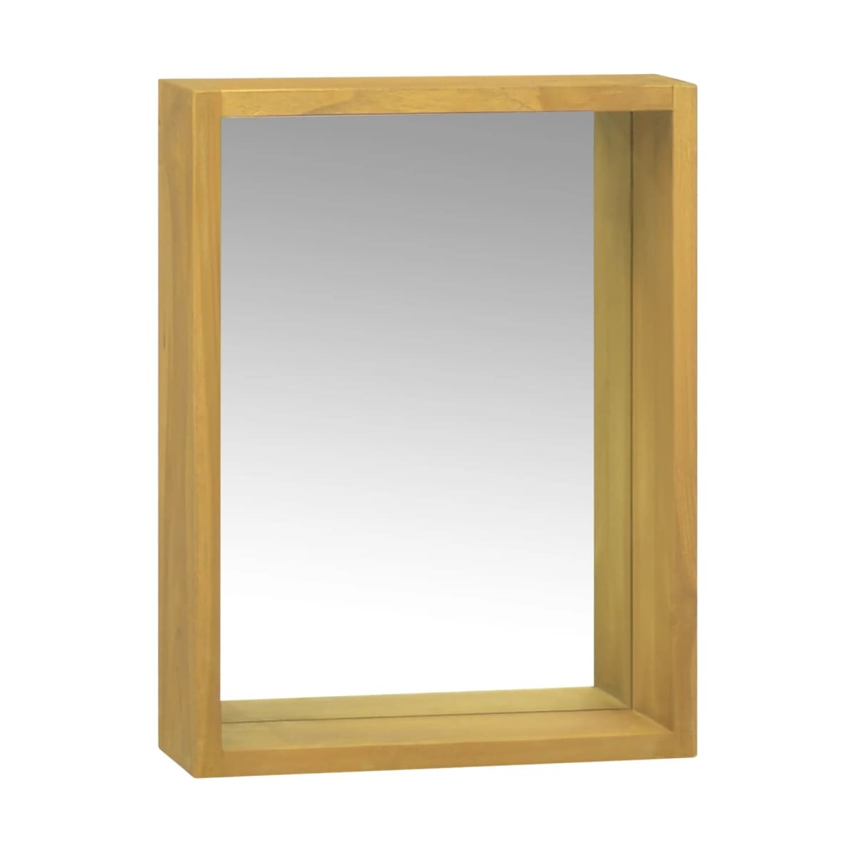 Este armario con espejo es más que un objeto práctico del día a día, además es una decoración atractiva para tu hogar. Madera de teca maciza: La madera de teca maciza es un hermoso material natural. Ha sido secada al horno y después lijada finamente para darle un aspecto muy suave. La madera de teca es conocida por su excepcional fuerza y resistencia a la intemperie.Estructura robusta: La estructura de madera garantiza su solidez y estabilidad. La madera de teca es la opción perfecta si deseas adquirir un mueble duradero.Función múltiple: Esta decoración de pared cuenta con 1 espejo de cristal para uso diario. Además, te ofrece una repisa para colocar los artículos de aseo esenciales.Función de montaje en la pared: Este espejo de pasillo no ocupará espacio en el suelo, puedes colgarlo en la pared fácilmente. Nota:Los tornillos y los tacos para el interior de la pared no están incluidos. Busca y utiliza tornillos y tacos adecuados para tus paredes. Si no lo tienes claro, busca asesoramiento profesional. Lee y sigue cada paso de las instrucciones cuidadosamente.El hermoso color y las vetas de madera pueden variar de una pieza a la otra, haciendo a cada pieza de tocador de pared de madera única y ligeramente diferente al resto.Recomendamos tratar el producto con aceite de teca o un acabado de base de agua para aumentar su vida útil.