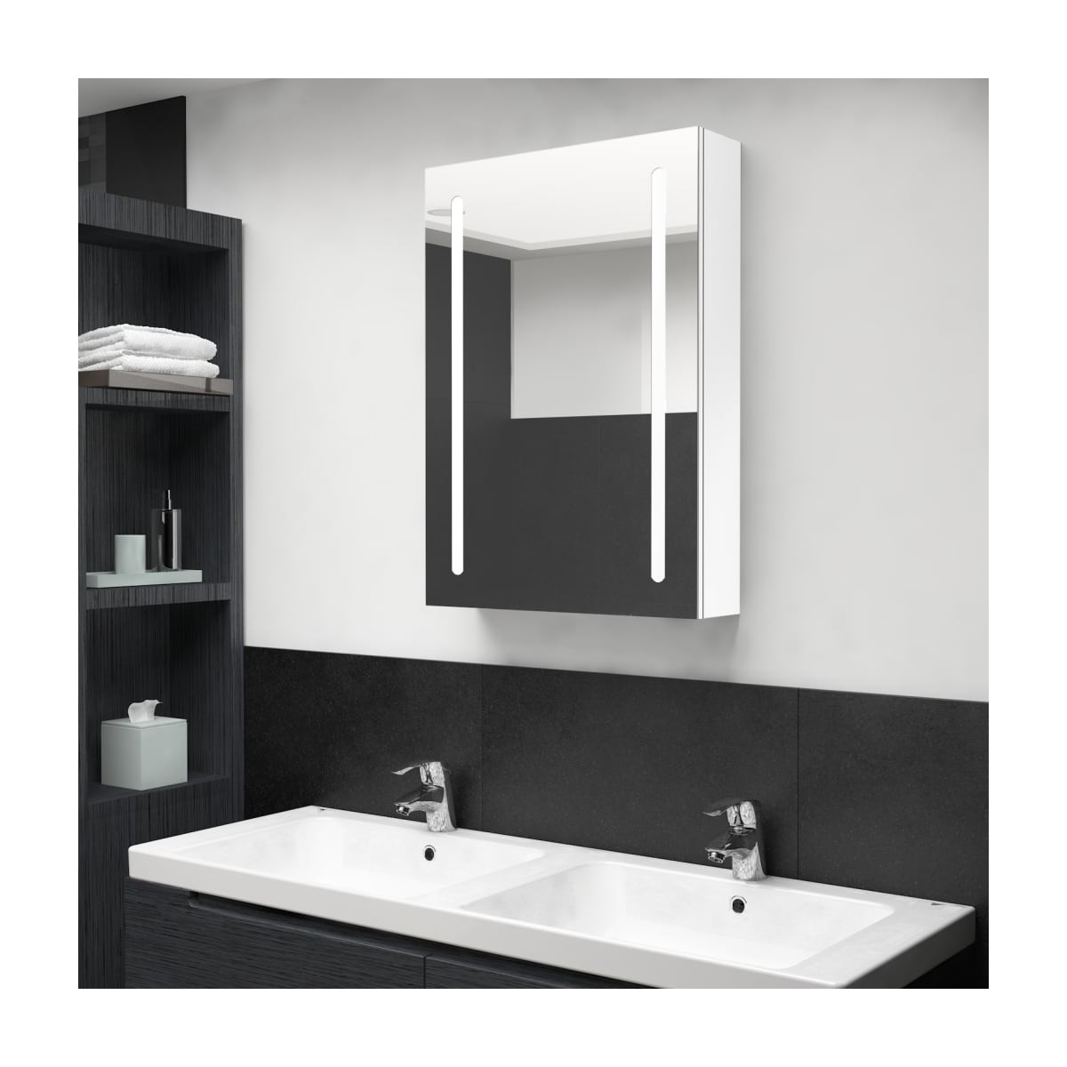 ¡Introduce un look bonito en tu baño con nuestro armario de tocador con espejo LED! ¡Nuestro armario con espejo de pared con LED agrega un toque de estilo moderno y una luz suave e iluminadora a cualquier habitación! Está hecho de tablero MDF de calidad con acabado de melamina, lo que garantiza el uso a largo plazo. Con las tiras de luz LED de doble eficiencia energética, puede verse con la luz más real para la aplicación de maquillaje, el aseo y el cuidado de la piel, y puede iluminar su habitación, su rostro y su sonrisa. En el interior incluye 3 estantes, que brindan un amplio espacio de almacenamiento en el armario para todos tus artículos de tocador y accesorios de belleza. Puedes encender/apagar fácilmente la luz con el botón inferior. ¡Elegante y funcional, este armario seguramente hará que el diseño de tu habitación sea originalmente excepcional! El mueble es fácil de instalar en la pared. Nota:El producto tiene un conector USB, pero no se incluye la fuente de alimentación USB de 5 V certificada.