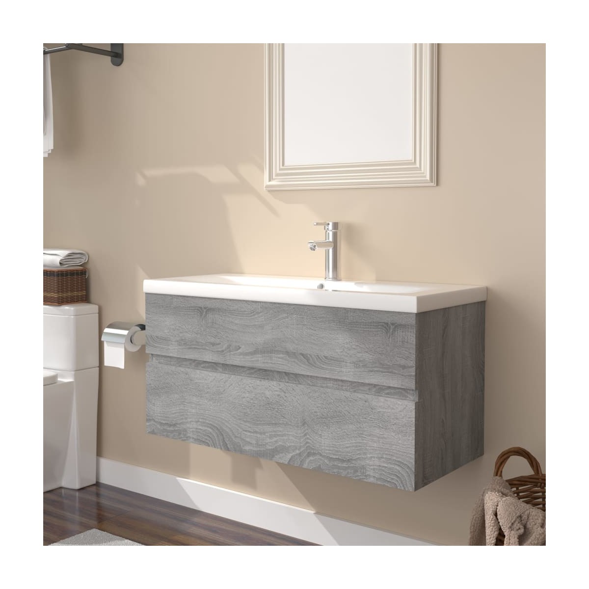 Este elegante mueble de baño con lavabo integrado y amplio espacio de almacenaje es un aporte excelente para el cuarto de baño, ¡ya que le dará un aspecto ordenado y llamativo! Material robusto: El armario para lavabo está hecho de madera contrachapada, que tiene una calidad excepcional, con una superficie lisa y también cuenta con fuerza, estabilidad y resistencia a la humedad.Amplio almacenaje: El armario de baño posee un cajón, que ofrece un amplio espacio de almacenamiento para guardar artículos en el baño.Diseño práctico: La parte superior de este armario de baño es ideal para colocar el lavamanos.Función de montaje en la pared: El armario del baño puede montarse en la pared para añadir espacio de almacenamiento adicional. Así podrás aprovechar al máximo el espacio del suelo y mantener la zona limpia.Rebosadero: También está equipado con un agujero de desagüe para que fluya el agua cuando se llena demasiado. Nota:Los tornillos y los tacos para el interior de la pared no están incluidos. Busca y utiliza tornillos y tacos adecuados para tus paredes. Si no lo tienes claro, busca asesoramiento profesional. Lee y sigue cada paso de las instrucciones cuidadosamente.El grifo y el desagüe no están incluidos en la entrega.Cada producto viene con un manual de montaje en la caja para facilitar el montaje.