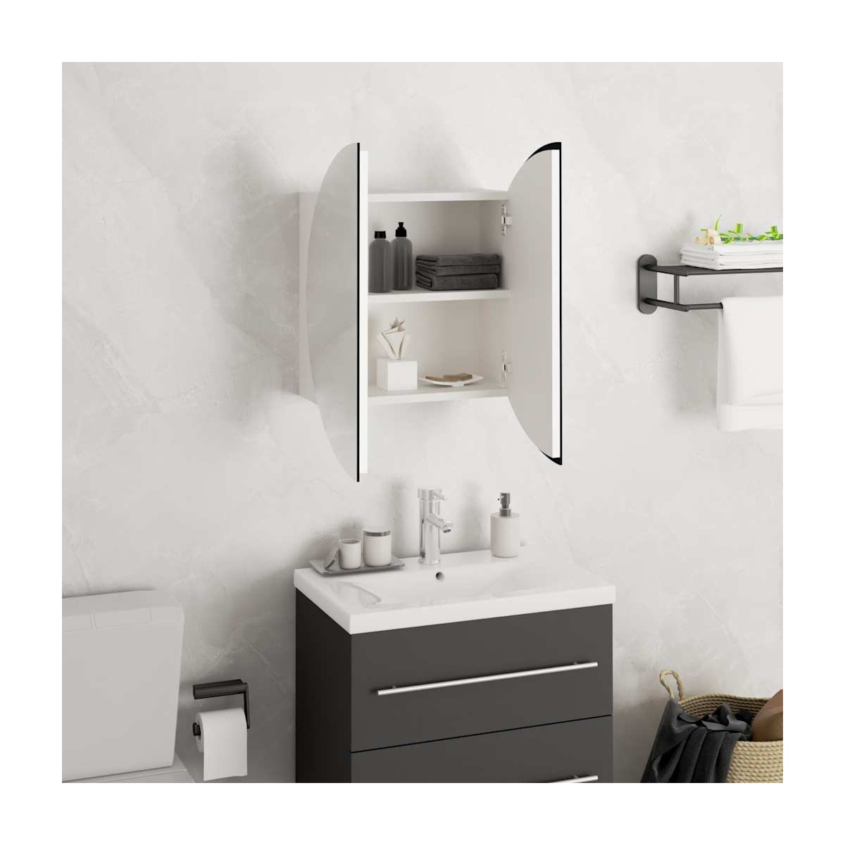 Mantén ordenado el maquillaje con este moderno armario de baño con un espejo redondo y una tira de LED. Material duradero: La madera contrachapada tiene una calidad excepcional, con una superficie lisa y también cuenta con fuerza, estabilidad y resistencia a la humedad. Hecho de madera contrachapada, el mueble con espejo y LED es fácil de limpiar.Espejo útil: El bonito espejo proporciona una visión clara para ponerte maquillaje y añade un toque elegante al mueble de baño.Luces LED: El armario de pared tiene una tira de LED, equipada con una interfaz de USB, por lo que resulta práctico de usar.Amplio espacio de almacenaje: Este mueble con espejo para joyas cuenta con grandes compartimentos, que ofrecen sitio para todas tus cosas y para mantenerlas organizadas.Diseño de montaje en la pared: El mueble de baño con espejo y LED se puede colgar de la pared. De este modo, podrás aprovechar al máximo el espacio del suelo y mantener la zona limpia. Nota:Cada producto viene con un manual de montaje en la caja para facilitar el montaje.Los tornillos y los tacos para el interior de la pared no están incluidos. Busca y utiliza tornillos y tacos adecuados para tus paredes. Si no lo tienes claro, busca asesoramiento profesional. Lee y sigue cada paso de las instrucciones cuidadosamente.Tiene un conector USB y el adaptador USB de 5V no está incluido.