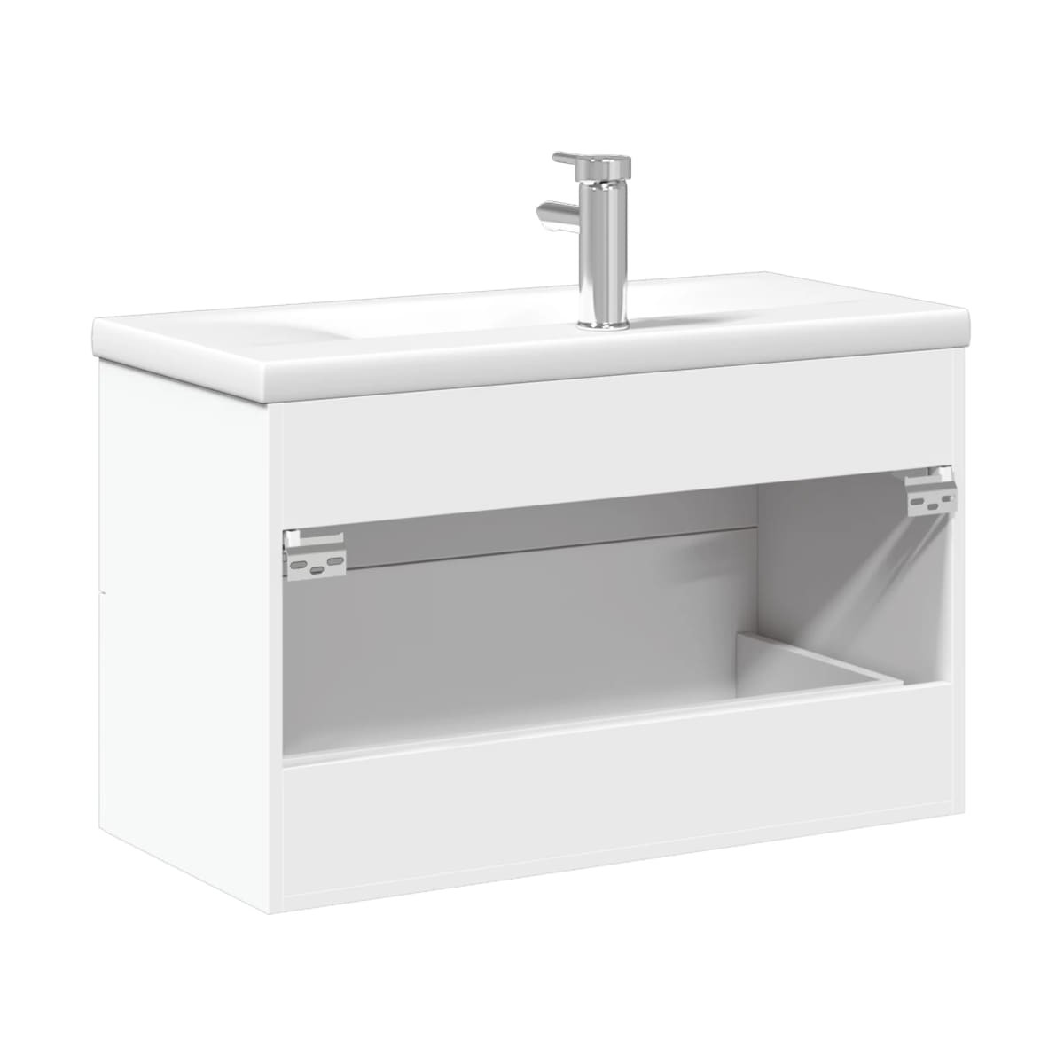Este elegante mueble de baño con lavabo integrado y amplio espacio de almacenaje es un aporte excelente para el cuarto de baño, ¡ya que le dará un aspecto ordenado y llamativo! Material robusto: El armario para lavabo está hecho de madera contrachapada, que tiene una calidad excepcional, con una superficie lisa y también cuenta con fuerza, estabilidad y resistencia a la humedad.Amplio almacenaje: El armario de baño posee 1 cajón, que ofrece un amplio espacio de almacenamiento para guardar artículos en el baño.Función de montaje en la pared: El armario del baño puede montarse en la pared para añadir espacio de almacenamiento adicional. Así podrás aprovechar al máximo el espacio del suelo y mantener la zona limpia.Elegante lavabo: El lavabo del baño está hecho de cerámica lisa de larga duración y fácil limpieza. La superficie esmaltada aporta un diseño moderno y elegante a la vez.Práctico rebosadero: El lavabo está equipado con una opción para evitar rebosamientos y permitir que el agua salga si se llena demasiado. Información útil:Los tornillos y los tacos para el interior de la pared no están incluidos. Busca y utiliza tornillos y tacos adecuados para tus paredes. Si no lo tienes claro, busca asesoramiento profesional. Lee y sigue cada paso de las instrucciones cuidadosamente.El grifo y el escurridor de empuje con función de rebosadero están incluidos.El grifo es de agua fría y caliente, y si necesitas agua caliente, hay que conectar un calentador de agua.