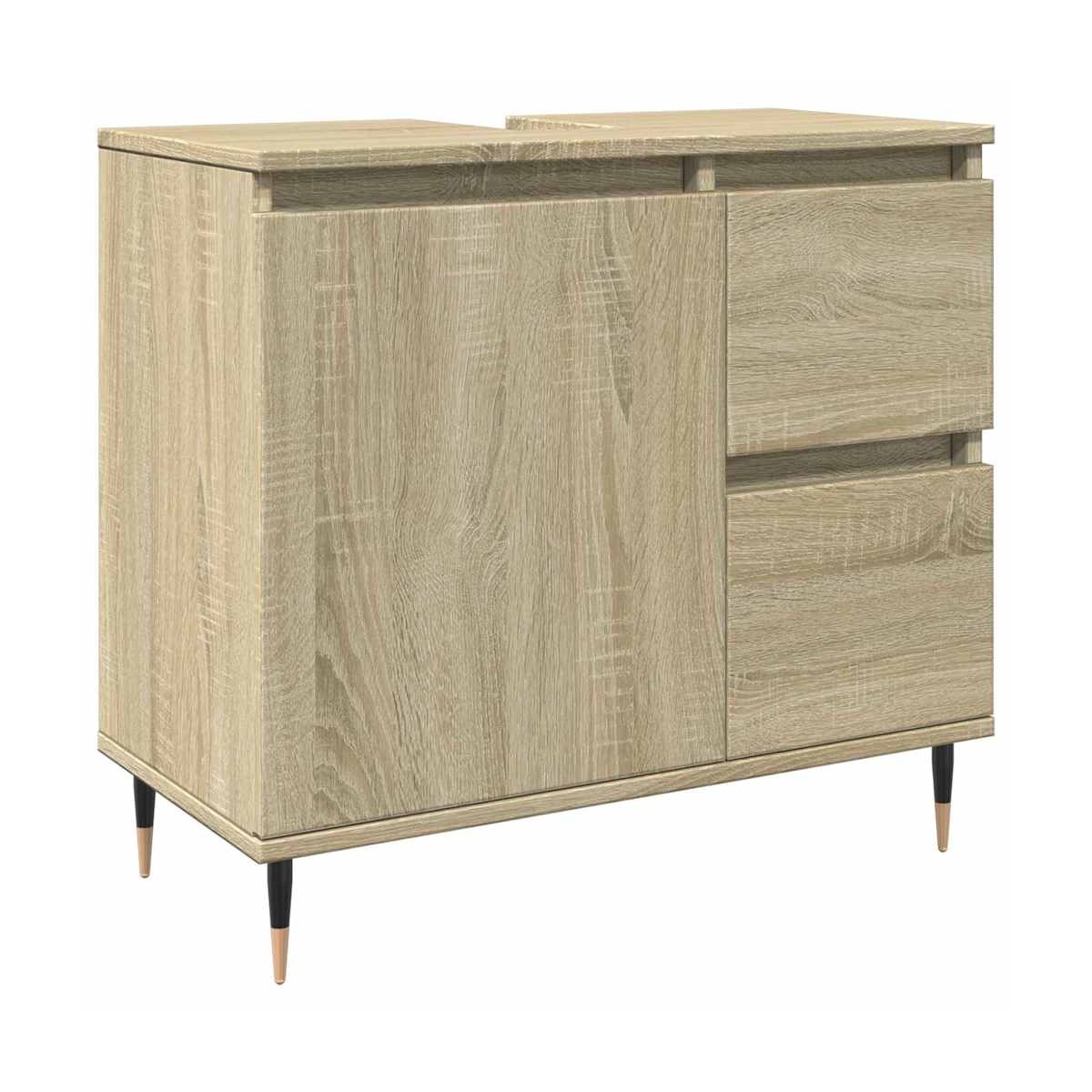 ¡Este mueble para lavabo de baño está diseñado para ser un gra aporte a tu baño, dándole una apariencia ordenada y llamativa! Material duradero: La madera contrachapada tiene una calidad excepcional, con una superficie lisa y también cuenta con fuerza, estabilidad y resistencia a la humedad.Amplio espacio de almacenamiento: El mueble de baño tiene 1 compartimento grande y 2 cajones, lo que proporciona un amplio espacio para acomodar fácilmente tus artículos de tocador esenciales y artículos de baño como jabones, champú, pasta de dientes, etcétera.Puerta práctica: Mantén ordenado el espacio al esconder los pequeños objetos básicos detrás de la puerta de este aparador. Y la puerta se puede montar a la izquierda o a la derecha según tus preferencias.Patas de hierro: Las patas de hierro dan un estilo industrial a la casa, además de garantizar la estabilidad del mueble de almacenaje para el baño. Advertencia:Para evitar que vuelque, este producto debe usarse con el dispositivo de fijación a la pared suministrado.