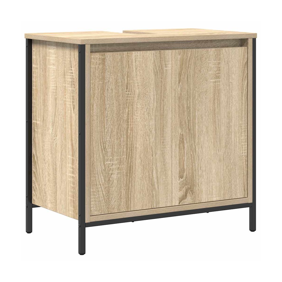 El mueble de lavabo de baño ofrece soluciones de almacenamiento versátiles, manteniendo su espacio ordenado y organizado al tiempo que añade un toque práctico y moderno a su espacio vital. Material estable y duradero: La madera de ingeniería es un material duradero y estable con una superficie lisa que es resistente a la humedad, la deformación y la rotura, lo que la convierte en una opción fiable para una variedad de proyectos.Amplio espacio de almacenamiento: el gabinete cuenta con 2 compartimentos, lo que garantiza que sus artículos estén bien organizados y ordenados, brindando un amplio espacio para un fácil acceso a varios artículos del baño.Tablero resistente y sólido: el tablero resistente ofrece una superficie confiable para mantener sus artículos esenciales a mano, lo que lo hace perfecto para el uso diario. Ya sea que esté colocando artículos de tocador o artículos decorativos, su durabilidad garantiza que pueda realizar varias tareas con facilidad.Patas ajustables: Las patas ajustables con almohadillas de plástico mantienen el armario de baño equilibrado sobre suelos irregulares y aumentan la estabilidad.Fácil de mantener: Gracias a su superficie lisa, el armario de almacenamiento del baño es fácil de limpiar con un paño húmedo y requiere menos mantenimiento. Información útil:El lavabo no está incluido en la entrega. Advertencia:Para evitar que vuelque, este producto debe usarse con el dispositivo de fijación a la pared suministrado.