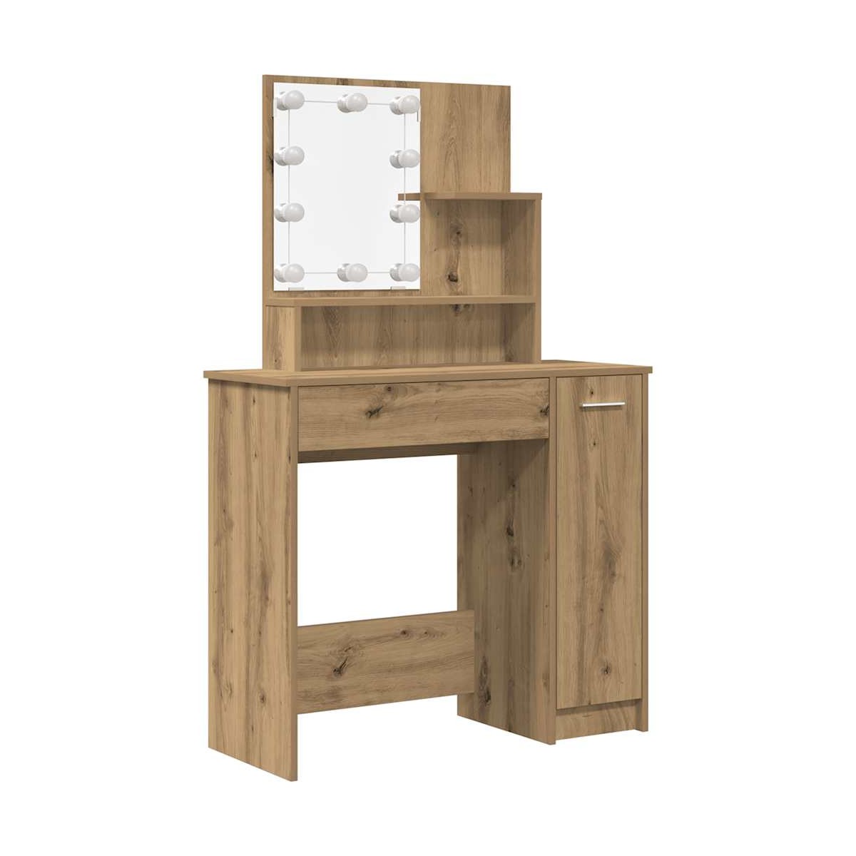 Este moderno juego de tocador con luces LED es un excelente complemento para la decoración de tu dormitorio. ¡Además, te permite tener tus cosméticos a mano! Material duradero: La madera de ingeniería tiene una calidad excepcional, con una superficie lisa y también cuenta con fuerza, estabilidad y resistencia a la humedad.Espejo utilitario: el hermoso espejo incluido proporciona una vista clara para la aplicación de maquillaje y agrega un toque elegante al escritorio de maquillaje.Amplio espacio de almacenamiento: la mesa de maquillaje ofrece un amplio espacio de almacenamiento para mantener tus artículos cosméticos esenciales bien organizados, dejándote con un escritorio ordenado y limpio.Luces LED regulables: este tocador tiene luces LED alrededor del espejo. Puedes cambiar fácilmente entre 3 colores de luz (frío, cálido y neutro) y ajustar el brillo mediante el práctico controlador.Fácil de mantener: Gracias a su superficie lisa, el tocador es fácil de limpiar con un paño húmedo y requiere menos mantenimiento. Advertencia:Para evitar que vuelque, este producto debe usarse con el dispositivo de fijación a la pared suministrado. Información útil:El producto tiene un conector USB que necesita una fuente de alimentación USB certificada de 5 V (no incluida).