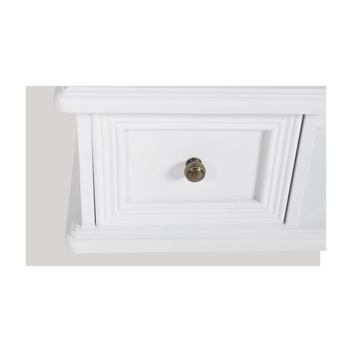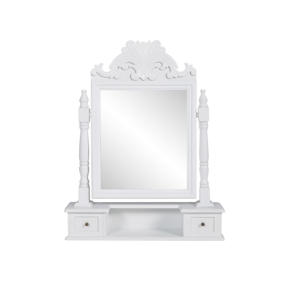 Esta mesa de tocador bellamente terminada presenta detalles elaborados por todas partes. La artesanía con la que está hecha le da un aspecto clásico y elegante.Un elegante espejo cuadrado está en el centro. El espejo se puede ajustar a varios ángulos según sea necesario. La base tiene dos pequeños cajones extraíbles en los que puede guardar sus objetos de valor. Este tocador está hecho de MDF de alta calidad. Se puede poner encima de cofres o de una mesa para formar una unidad de tocador. Este producto es 1 mesa de tocador con dos cajones y 1 espejo.Nota: Dado que este mueble está hecho a mano, hecho de madera y pintado de blanco, podría venir con alguna pequeña imperfección.