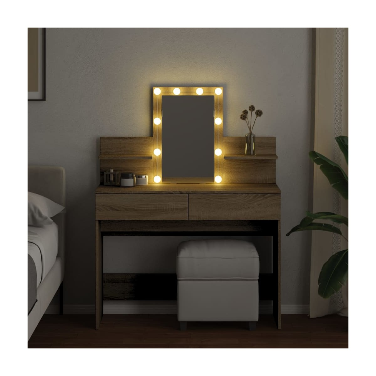 ¡La mesa de tocador es un gran aporte para la decoración del dormitorio y para tener el maquillaje a mano al mismo tiempo! Material estable y duradero: La madera de ingeniería es un material duradero y estable con una superficie lisa que es resistente a la humedad, la deformación y la rotura, lo que la convierte en una opción fiable para una variedad de proyectos.Amplio espacio de almacenaje: La mesa de maquillaje con 2 cajones y 2 estantes ofrece un amplio espacio de almacenamiento para mantener tus diversos artículos de uso diario bien organizados y al alcance.Espejo útil: El bonito espejo incluido proporciona una visión clara para ponerte maquillaje y añade un toque elegante al tocador.Luz LED: El tocador tiene bombillas LED con USB, que se pueden cambiar fácilmente de modo blanco cálido a frío. Las bombillas LED que hay alrededor del espejo iluminarán tu belleza. Advertencia:Para evitar que vuelque, este producto debe usarse con el dispositivo de fijación a la pared suministrado.