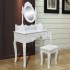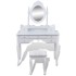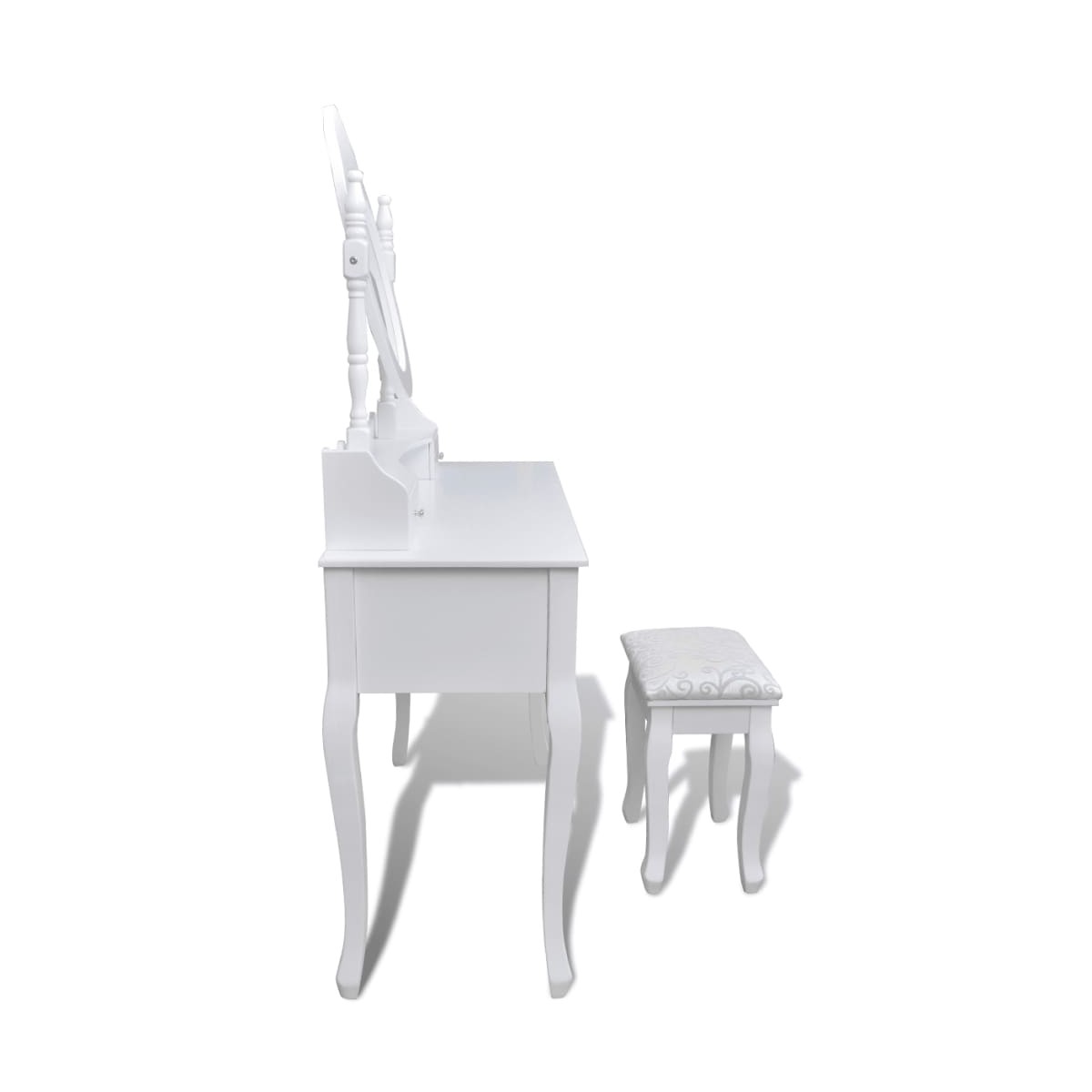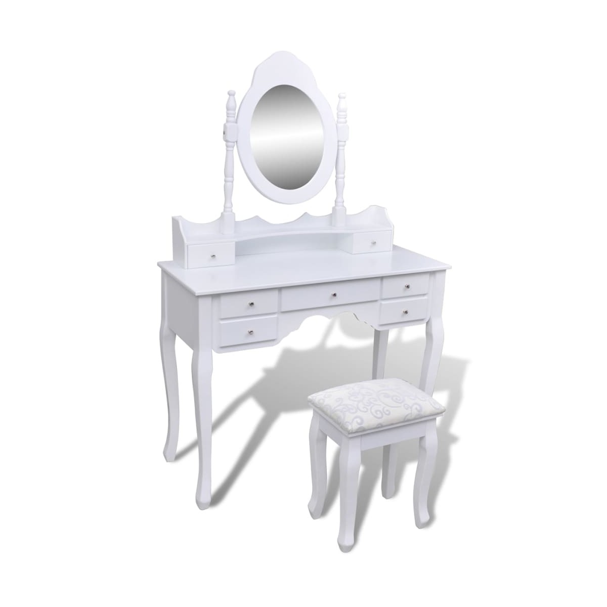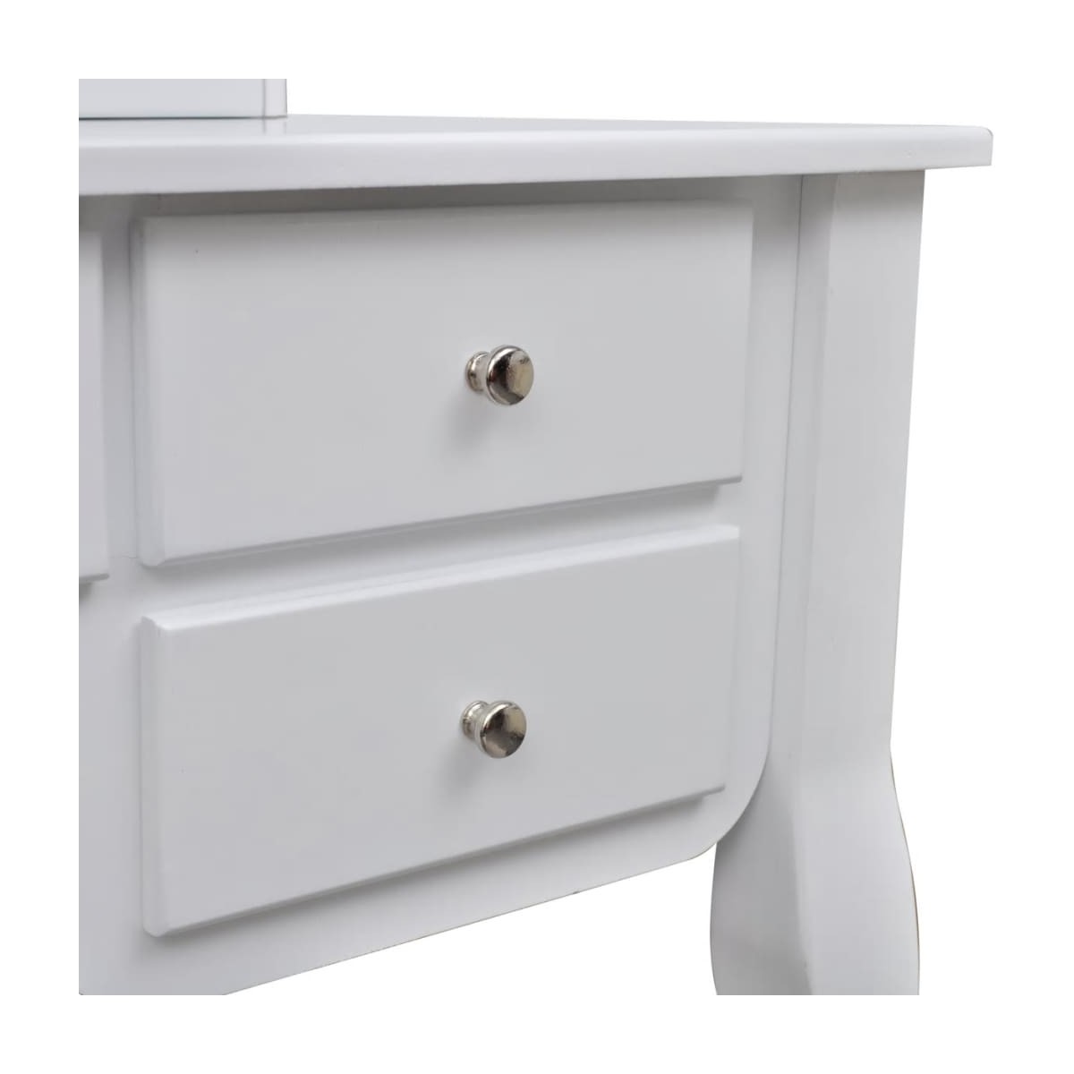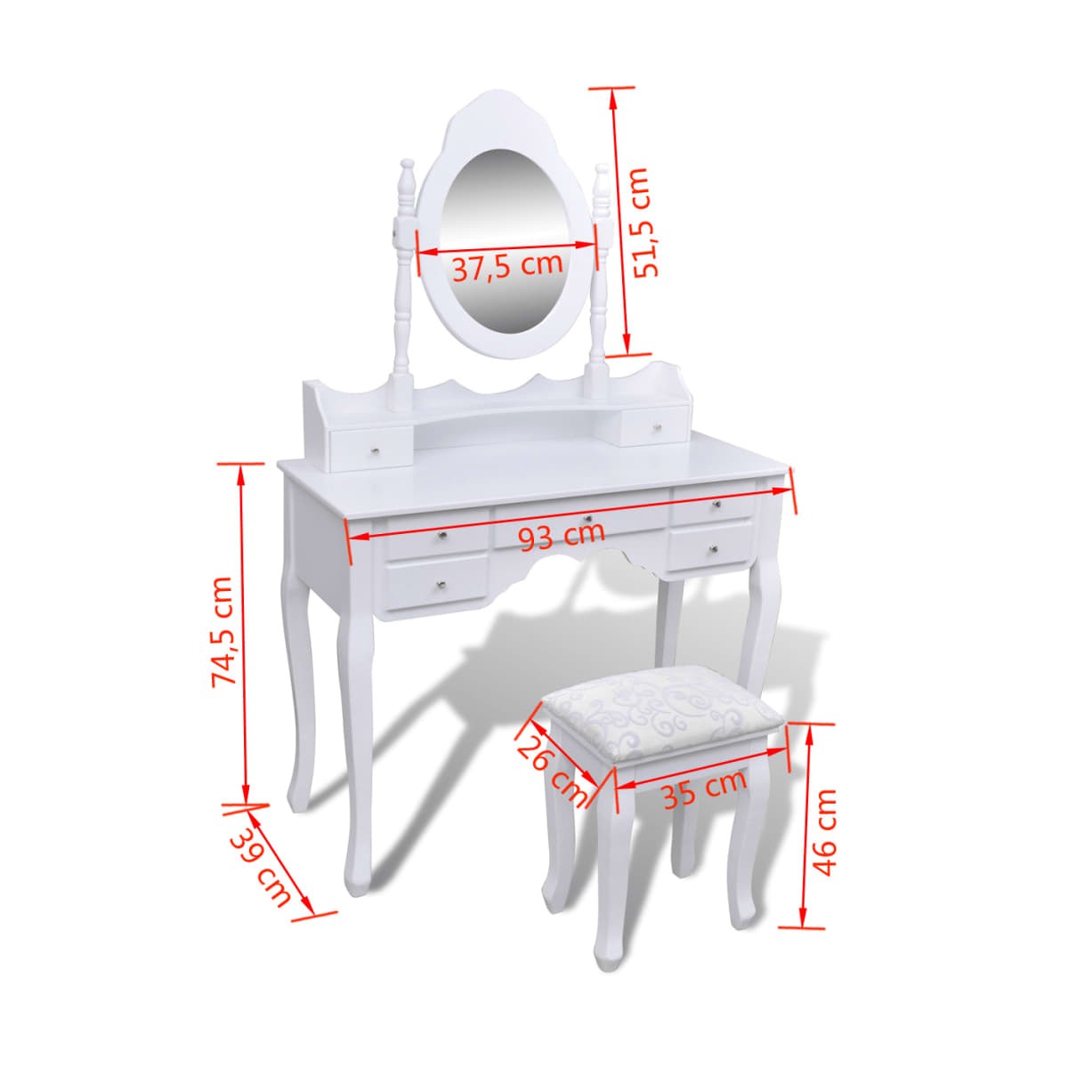 Este encantador conjunto XXL de tocador y taburete está hecho de madera de pino de alta calidad. Su estilo victoriano y acabado blanco limpio le dará elegancia y belleza a su tocador o vestidor. La exquisita mano de obra es otra característica destacada de este juego de mesa y taburete. El espejo de la mesa tiene una estructura libre, por lo que puede pivotar en el ángulo deseado. Para su sorpresa, el espejo y la mesa se pueden usar por separado. Siete elegantes cajones ofrecen espacio adicional para sus adornos, cosméticos y otras pertenencias privadas. Este tocador y taburete atraerá la atención allá donde se coloque. Es bastante fácil de montar con los accesorios de montaje incluidos en la entrega.