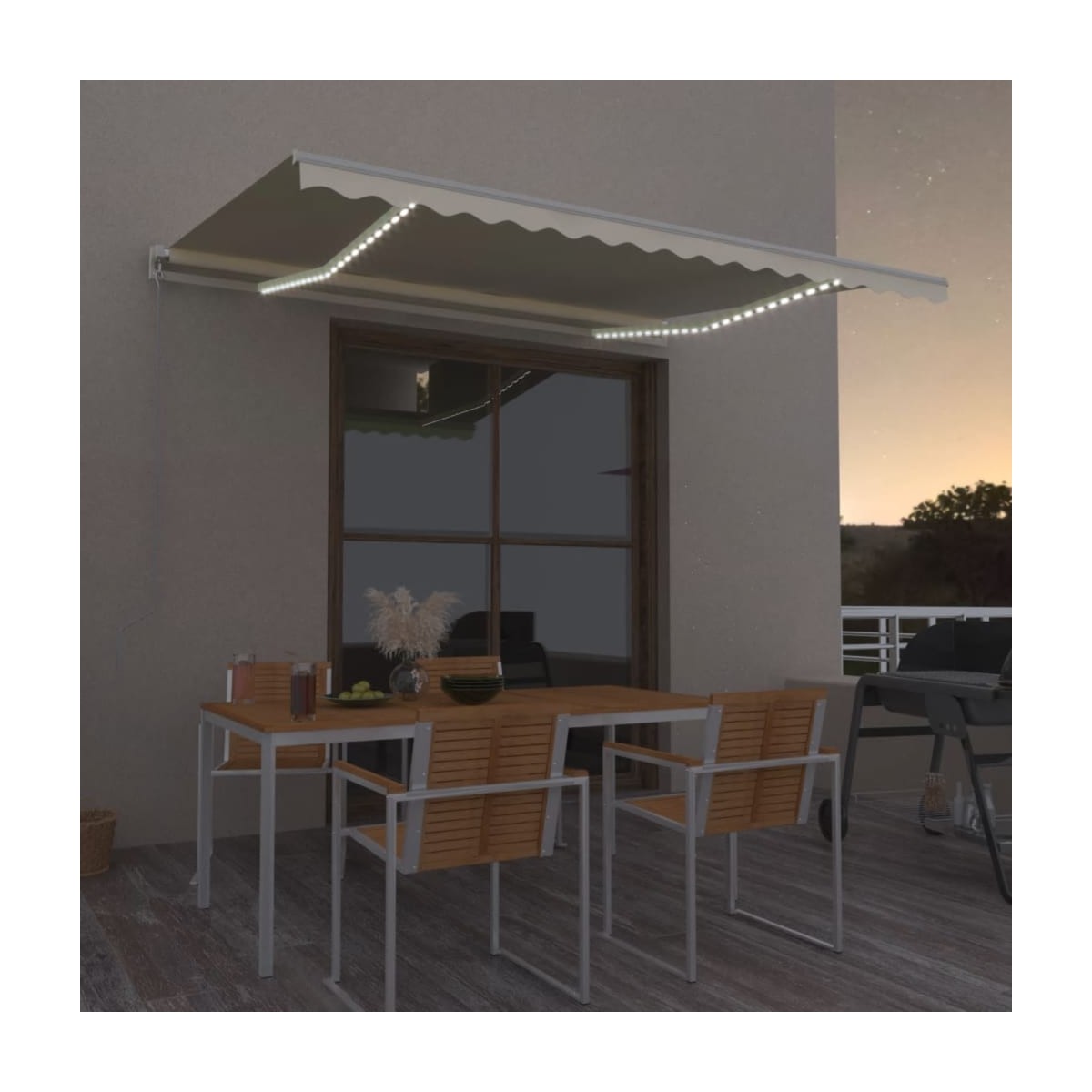 ¡Crea un lugar encantador y fresco en tus espacios exteriores con este toldo retráctil! Este toldo de exterior está construido con un marco de aluminio con recubrimiento en polvo resistente a la oxidación, lo que lo hace ligero pero resistente. La tela del toldo para patio está hecha de poliéster de alta densidad con revestimiento de PU, que es resistente a los rayos UVA y al agua. Además, el ángulo y la altura se pueden ajustar para satisfacer tus necesidades específicas. Puedes abrir y retraer el toldo sin problemas con la manivela larga. Además, las luces LED de energía solar brindan iluminación de bajo consumo durante la noche.
