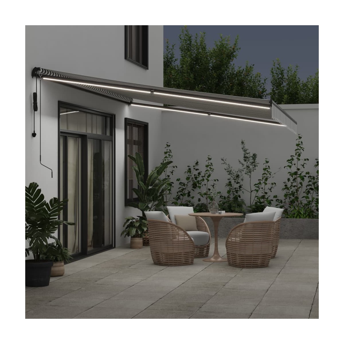 ¡Crea un lugar agradable y fresco en tu patio y protégete de los rayos UVA con este toldo retráctil! Material duradero: La estructura del toldo está hecha de aluminio con recubrimiento en polvo, por lo que es resistente y duradero. La tela con tratamiento superficial de PU es resistente a los rayos UV. Protegerá a tu familia o tus invitados de los rayos UV y del sol deslumbrante.Función automática: Puedes abrir y recoger el toldo fácilmente mediante el mando a distancia incluido.Fácil de manejar: El ángulo y la altura se pueden ajustar para satisfacer tus diferentes necesidades. La manivela larga permite abrir y recoger el toldo sin problemas.Luces LED y sensor de viento: Las luces LED integradas en el toldo iluminan tu espacio al aire libre y crean un ambiente acogedor y romántico cuando se pone el sol. También está equipado con un sensor de viento, que puede cerrar tu toldo automáticamente en días de mucho viento.Muchos usos: El toldo de pie posee un diseño sencillo y elegante que encajará en cualquier casa o establecimiento comercial. Sirve para muchos sitios, como balcones, patios, terrazas, restaurantes, cafeterías, tiendas, etc.