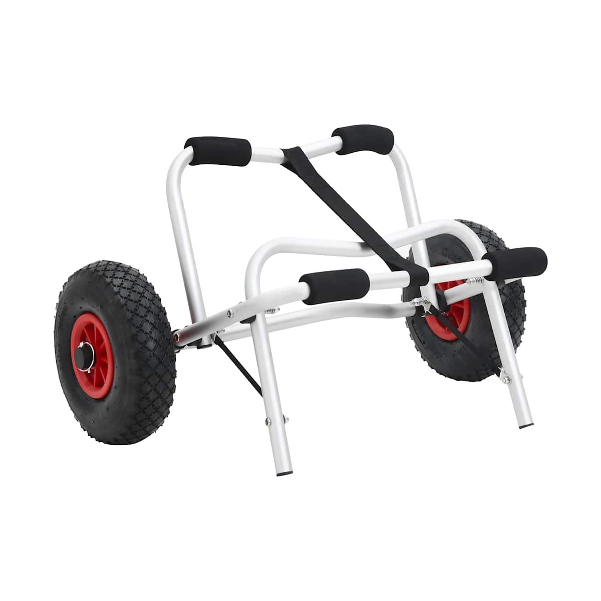 El carro de kayak es una buena herramienta para transportar tu kayak, ya sea que solo quieras visitar el lago o conducir hasta el mar. Robusto y duradero: La construcción de aluminio del carrito de kayak lo hace ligero, resistente a la oxidación e increíblemente duradero, por lo que se puede usar durante un largo período de tiempo.Seguro y protegido: El marco está cubierto con un acolchado de espuma, lo que evita que tu tabla de paddle se deslice o se raye. También incluye una correa para asegurar el producto.Transporte eficiente: Este carro para kayak tiene 2 ruedas inflables, que pueden transportar tu kayak de manera más eficiente y fácil.Fácil de guardar: Este carro para kayak es plegable y se puede guardar en la barca o en el maletero para ahorrar espacio cuando está plegado.Diversos usos: El carro de kayak es la opción ideal para transportar barcas, canoas o kayaks.