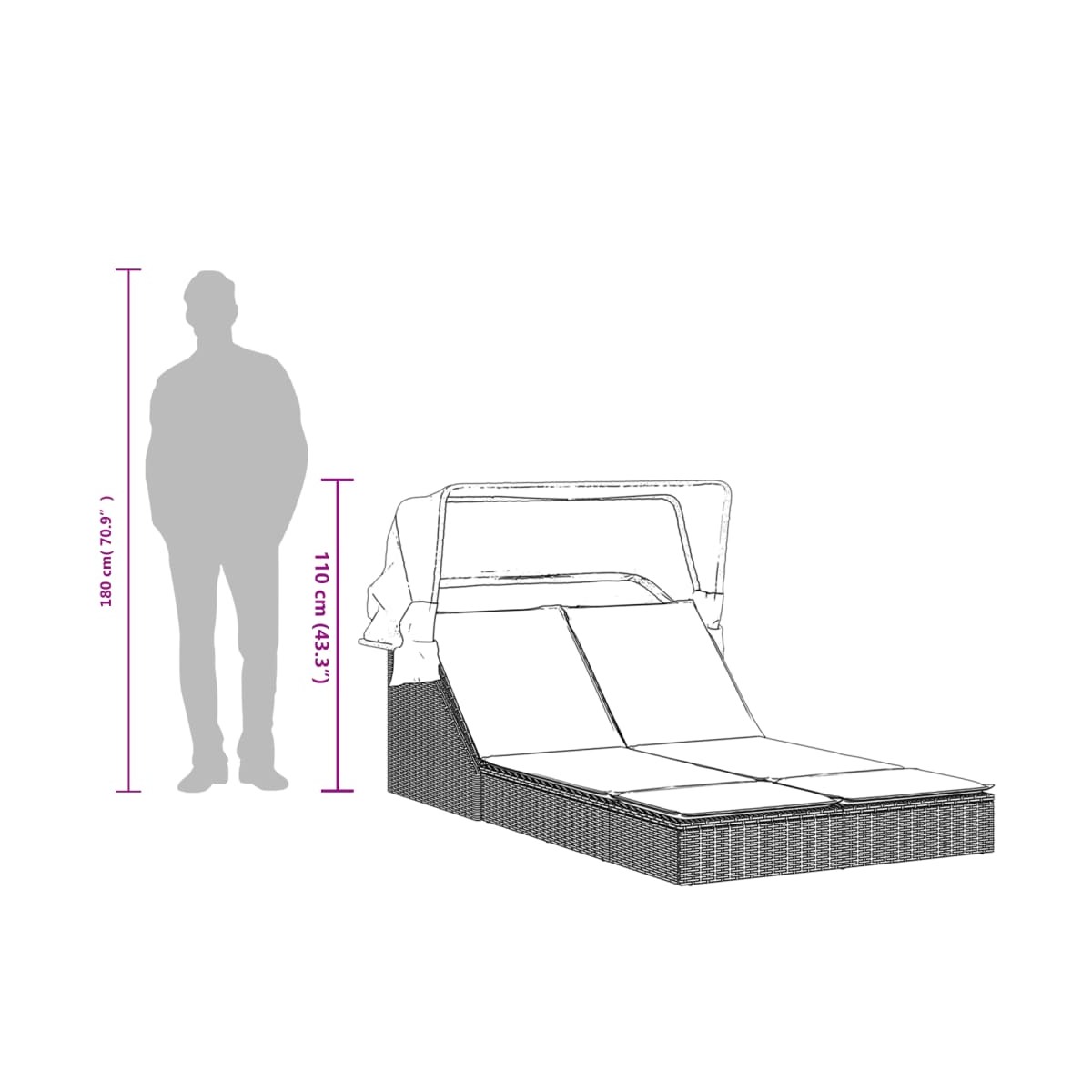 ¡Relájate y disfruta del aire libre en esta cómoda tumbona doble! Material duradero: El ratán PE, también conocido como ratán sintético, es un material sintético resistente y de bajo mantenimiento que se parece al ratán natural. Es ligero, fácil de limpiar y se usa comúnmente para muebles de exterior debido a su durabilidad y propiedades resistentes a la intemperie. Respaldo ajustable: Este mueble de exterior cuenta con un respaldo con 2 posiciones ajustables, con lo que puedes encontrar fácilmente la posición más cómoda y adecuada para relajarte. Capota retráctil: Gracias al toldo retráctil, podrás crear un ambiente exterior fresco y agradable durante todo el día. Experiencia de asiento cómoda: Estos muebles de exterior, completos con cojines acolchados gruesos, ofrecen una experiencia de asiento cómoda. Funda desenfundable y lavable: Estos cojines de asiento cuentan con fundas desenfundables para facilitar el lavado y mantenimiento. Información útil:Para asegurarte de que tus muebles de exterior se mantengan hermosos, recomendamos protegerlos con una funda impermeable.