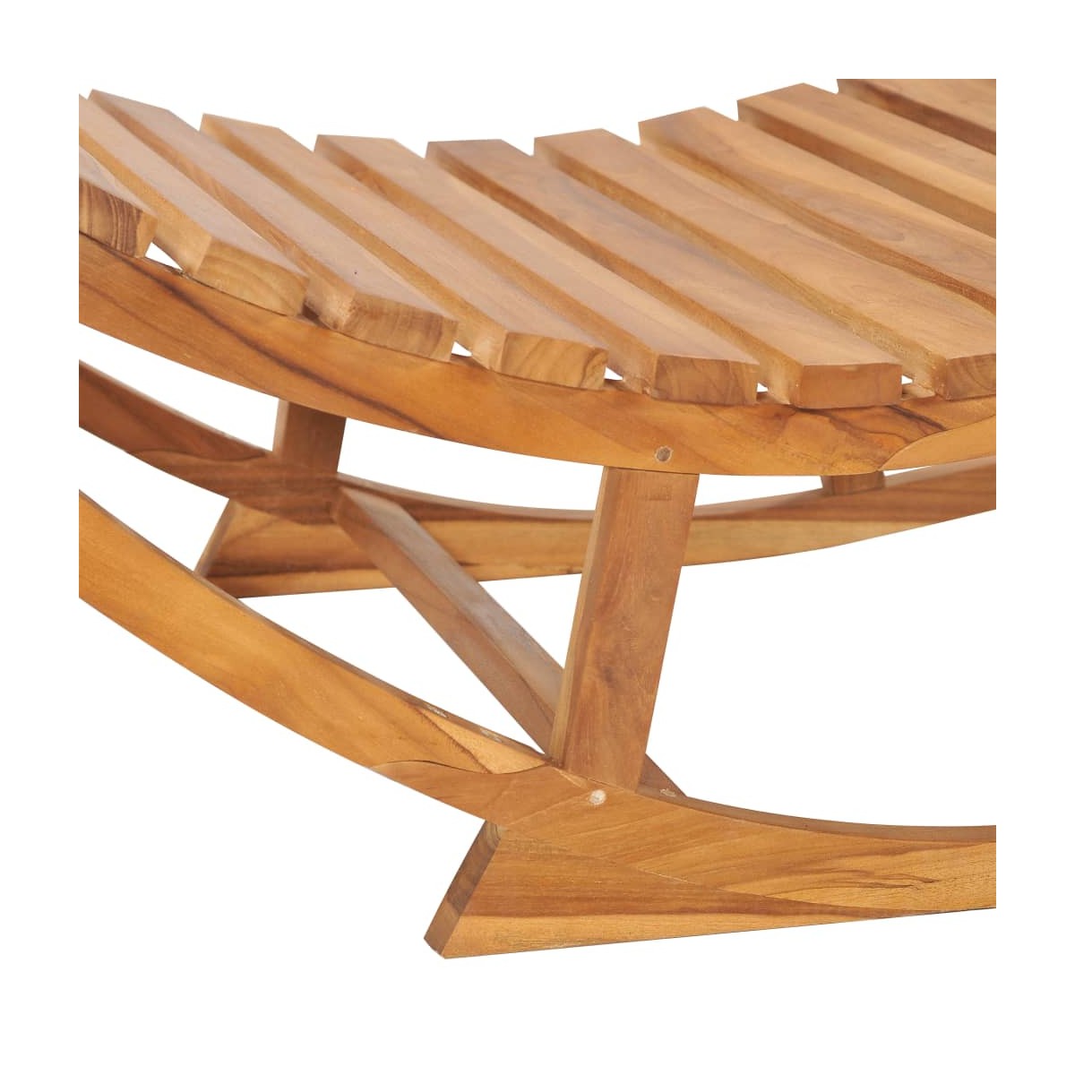 Esta tumbona mecedora de madera es adecuada para tomar el sol y relajarte en la piscina, balcón, patio o jardín durante tus vacaciones o tiempo de ocio. Construidas con madera maciza de teca muy duradera, estos muebles de teca han sido secados al horno y lijados finamente para darles una apariencia muy lisa. La madera de teca es conocida por su excepcional robustez y resistencia a la intemperie, lo que la hace mucho más adecuada para muebles de jardín que cualquier otro tipo de madera. La madera de teca es la elección perfecta si quieres comprar un mueble de jardín duradero. Esta tumbona está diseñada con el movimiento de balanceo para mayor relajación. El cojín incluido es más que un aporte práctico; también tiene una función decorativa. Nota: Para prolongar la vida útil de los muebles de exterior, te recomendamos que los limpies con regularidad y no los dejes al aire libre sin protección innecesariamente.Limpia: Usa una solución de jabón suave.Almacenamiento: Si es posible, guárdalos en un lugar fresco y seco en el interior. Si el producto se almacena al aire libre, protégelo con una funda impermeable. Limpia y seca el exceso de agua o nieve de las superficies planas después de una lluvia o nevada. Permite la ventilación para evitar daños relacionados con la humedad.