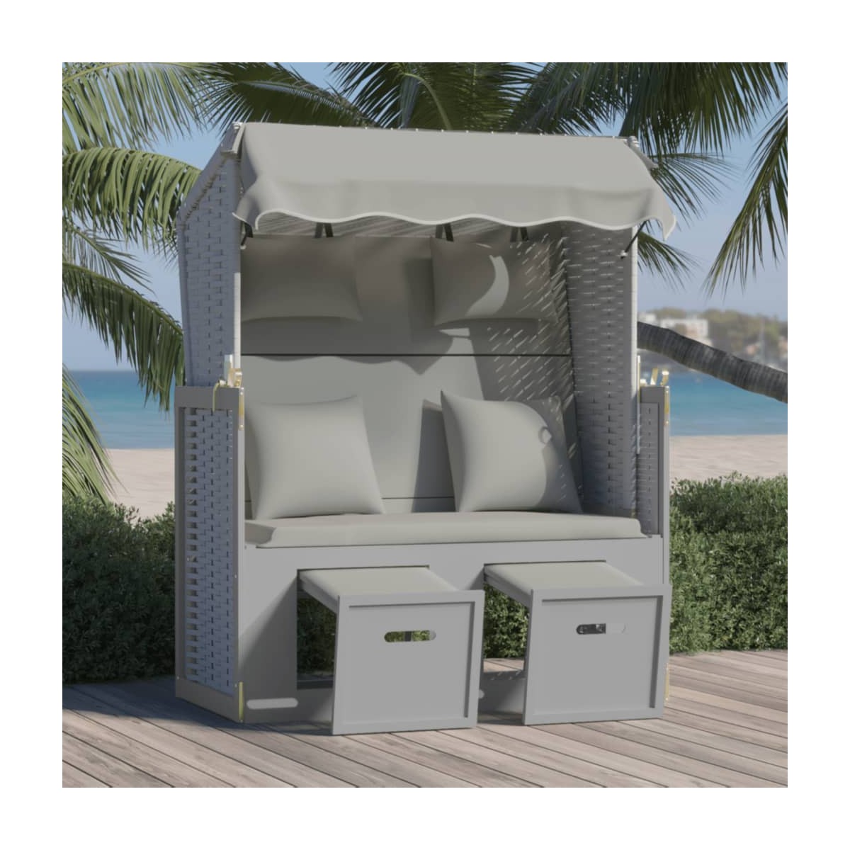 Este cómodo strandkorb ofrece un lugar amplio y agradable para relajarse en la playa, junto al río o en el jardín. Material de primera calidad: La tumbona de jardín, con una estructura de madera y tejido plano de ratán sintético, es robusta, resistente y fácil de limpiar con un paño húmedo.Características prácticas: La tumbona de playa está diseñada con un toldo para protegerte del sol, y los paneles laterales te permiten disfrutarla incluso en días de viento.Diseño extensible: El reposapiés extensible de la tumbona garantiza niveles aún mayores de confort.Respaldo ajustable: El respaldo de esta silla de playa se puede ajustar en 3 posiciones, para que siempre encuentres la posición ideal para relajarte.Experiencia de asiento cómoda: Los cojines bien acolchados para la cabeza y el respaldo que se incluyen brindan una cómoda experiencia de asiento. Nota:Para prolongar la vida de tus muebles de exterior, te recomendamos que los protejas con una funda impermeable.