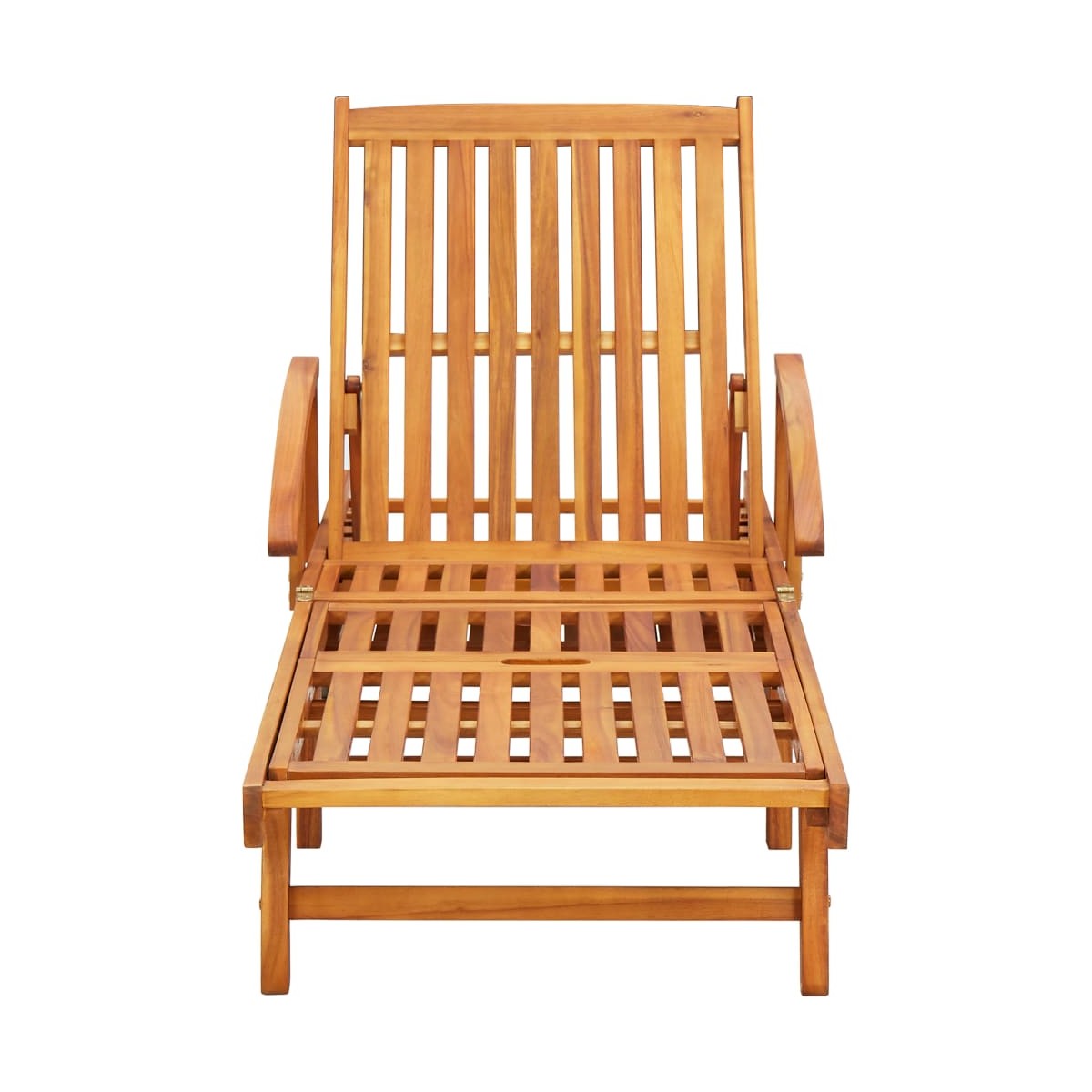 Este juego de tumbonas de madera combina estilo y funcionalidad y agregará un toque de encanto rústico a tu jardín, patio, terraza de la piscina u otro espacio de vida al aire libre. Construida con madera maciza de acacia, la tumbona es resistente a la intemperie, duradera y apta para uso en exteriores. Equipado con ruedas, se puede mover fácilmente. El respaldo y el reposapiés se pueden ajustar desde sentarte completamente erguido hasta estar completamente plano, lo que te ofrece la máxima comodidad. El diván se puede plegar cuando no se usa. El cojín incluido es más que un aporte práctico; también tiene una función decorativa. Nota: Para prolongar la vida útil de los muebles de exterior, te recomendamos que los limpies con regularidad y no los dejes al aire libre sin protección innecesariamente.Limpieza: Usa una solución de jabón suave.Almacenamiento: Si es posible, guarda el producto en un lugar fresco y seco en el interior. Si el producto se almacena al aire libre, protégelo con una funda impermeable. Limpia y seca el exceso de agua o nieve de las superficies planas después de una lluvia o nevada. Permite la ventilación para evitar daños relacionados con la humedad.
