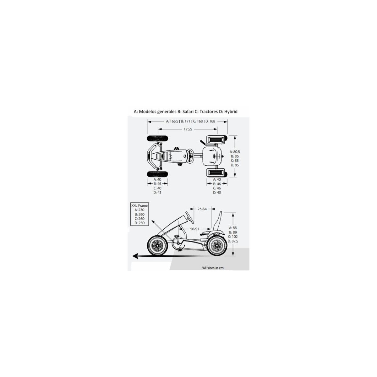 Los tractores de pedales eléctricos de BERG vienen con un chasis más grande y reforzado, 10 cm más largo (XXL) que lo hacen mejor para adultos, incluso adultos altos.