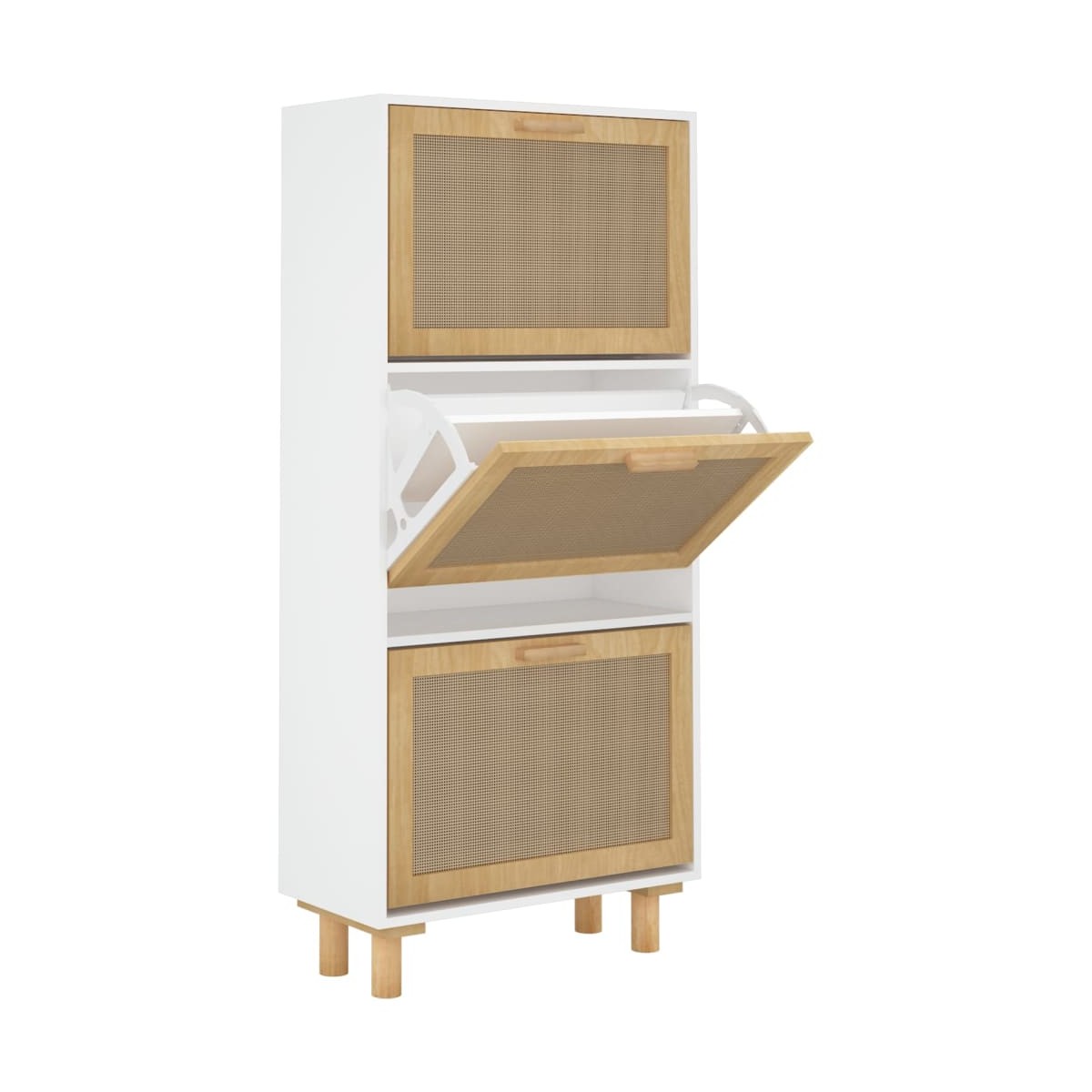 Este zapatero, con un diseño escandinavo, es un excelente mueble para guardar tus zapatos de manera organizada. Es adecuado para la entrada, el pasillo, la sala de estar, el dormitorio y otros lugares que quieras. Material duradero: La madera contrachapada tiene una calidad excepcional, con una superficie lisa y también cuenta con fuerza, estabilidad y resistencia a la humedad.Amplio espacio de almacenaje: Esta estantería para zapatos cuenta con 3 cajones, que proporcionan un amplio espacio de almacenamiento para mantener el calzado organizado y al alcance. Además, el diseño de tejido de ratán natural en el cajón añade una belleza adicional.Diseño de cajón abatible: Con el diseño de cajón abatible, este armario zapatero es fácil de abrir y cerrar. Nota:Cada producto viene con un manual de montaje en la caja para facilitar el montaje. Advertencia:Para evitar el vuelco, este producto debe usarse con el dispositivo provisto para fijarlo a la pared.