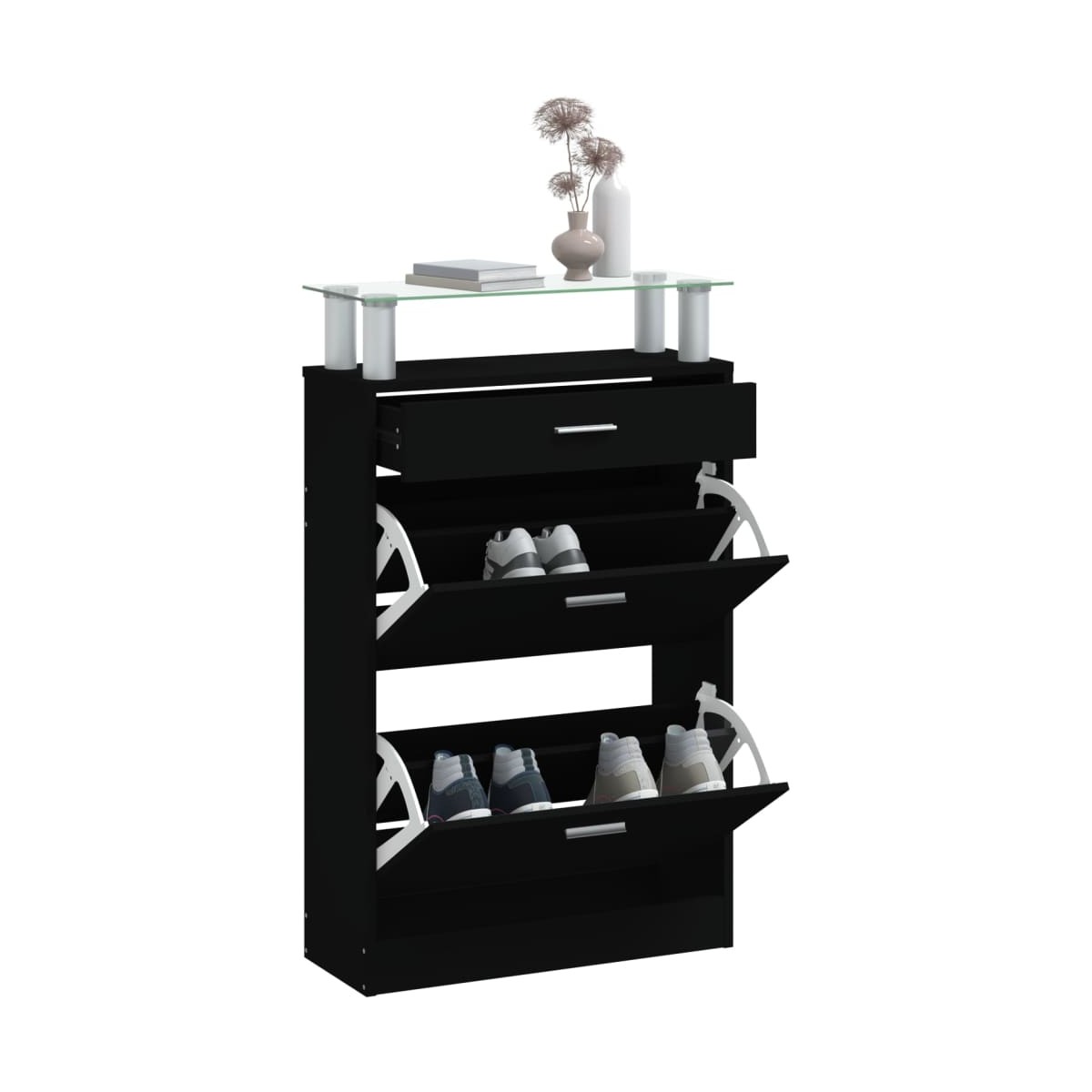 Este mueble zapatero, con un diseño moderno y elegante, es una excelente pieza de mobiliario para guardar el calzado de forma organizada. Es adecuado para el recibidor, el pasillo, el salón, el dormitorio y otras estancias. Material duradero: La madera contrachapada tiene una calidad excepcional, con una superficie lisa y también cuenta con fuerza, estabilidad y resistencia a la humedad.Amplio espacio de almacenaje: Esta estantería para zapatos cuenta con 3 cajones, que proporcionan un amplio espacio de almacenamiento para mantener el calzado organizado y al alcance.Diseño de cajón abatible: Con el diseño de cajón abatible, este armario zapatero es fácil de abrir y cerrar.Práctica superficie: El robusto estante de vidrio superior del armario zapatero es ideal para colocar objetos decorativos, marcos de fotos o macetas. Nota:Cada producto viene con un manual de montaje en la caja para facilitar el montaje. Advertencia:Para evitar el vuelco, este producto debe usarse con el dispositivo provisto para fijarlo a la pared.