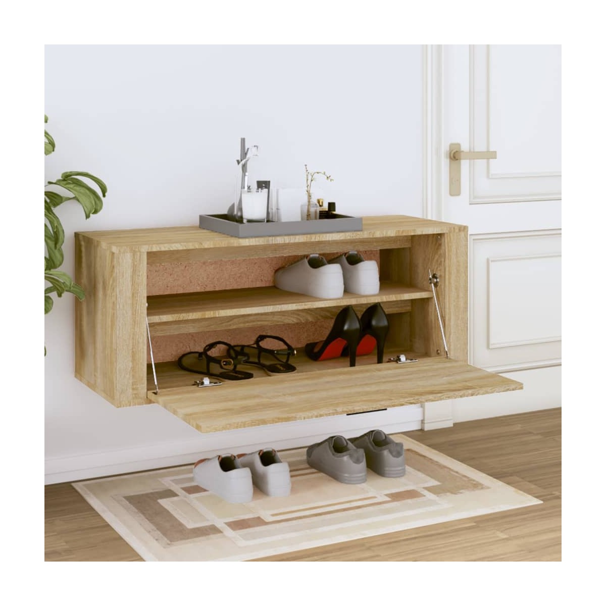 ¡Con este moderno y compacto de zapatero de pared, nunca más tendrás que molestarte con los zapatos que abarrotan tu casa! Material robusto: La madera contrachapada tiene una calidad excepcional, con una superficie lisa y también cuenta con fuerza, estabilidad y resistencia a la humedad. Hecho de madera contrachapada, el mueble zapatero es fácil de limpiar.Amplio espacio de almacenaje: El armario zapatero está equipado con 2 compartimentos para guardar el calzado de forma ordenada.Puerta práctica: Mantén limpias tus cosas al ocultarlas detrás de la puerta de este armario zapatero. Además, la puerta cuenta con un diseño abatible que facilita alcanzar los artículos.Superficie estable: El zapatero tiene una superficie estable, ideal para colocar las llaves y pequeños objetos decorativos. Nota:Cada producto viene con un manual de montaje en la caja para facilitar el montaje.
