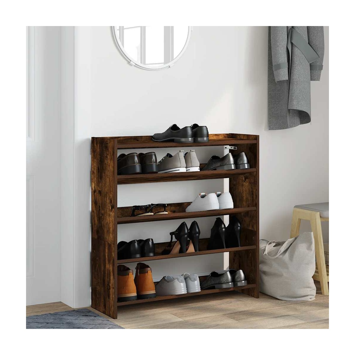 ¡Mantén los zapatos ordenados y crea un ambiente organizado con este elegante zapatero! Material estable y duradero: La madera de ingeniería es un material duradero y estable con una superficie lisa que es resistente a la humedad, la deformación y la rotura, lo que la convierte en una opción fiable para una variedad de proyectos.Amplio espacio de almacenamiento: El zapatero tiene estantes, lo que proporciona un amplio espacio para el almacenamiento de zapatos. Con este práctico organizador de zapatos, ya no te molestarán los zapatos que abarrotan el suelo.Superficie práctica: el estante superior resistente del zapatero es ideal para exhibir objetos decorativos, marcos de fotos o guardar algo como llaves o billeteras que pueda necesitar a mano.Diseño que ahorra espacio: el zapatero delgado está diseñado para adaptarse perfectamente a espacios pequeños como entradas, pasillos, vestíbulos, etc.Fácil de mantener: Gracias a su superficie lisa, la mesa se limpia fácilmente con un paño húmedo y requiere menos mantenimiento.Advertencia:Para evitar que vuelque, este producto debe usarse con el dispositivo de fijación a la pared suministrado.