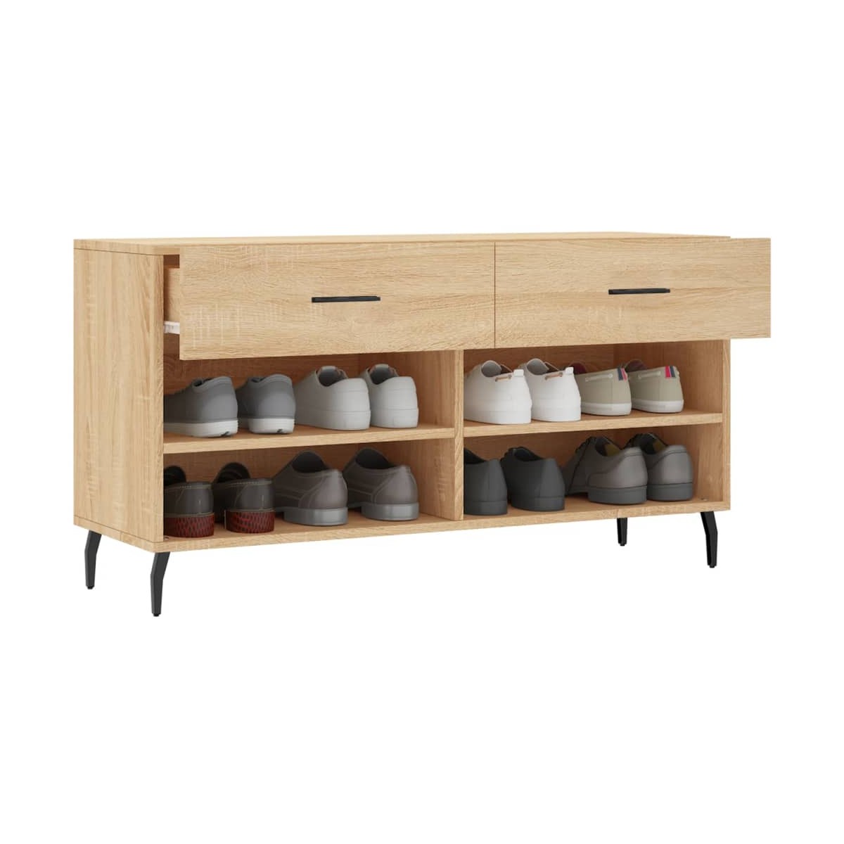 Guarda tus zapatos con este elegante y práctico banco zapatero. Es una opción perfecta para mantener ordenado el calzado. Material duradero: La madera contrachapada tiene una calidad excepcional, con una superficie lisa y también cuenta con fuerza, estabilidad y resistencia a la humedad.Amplio espacio de almacenaje: El banco zapatero tiene 2 cajones y 4 estantes que ofrecen un amplio espacio para los zapatos y otros objetos pequeños.Superficie robusta: La resistente superficie del mueble zapatero te permite sentarte cómodamente mientras te quitas o te pones los zapatos.Patas de hierro: Las patas de hierro dan un estilo industrial a la casa mientras garantizan su estabilidad. Advertencia:Para evitar que vuelque, este producto debe usarse con el dispositivo de fijación a la pared incluido.