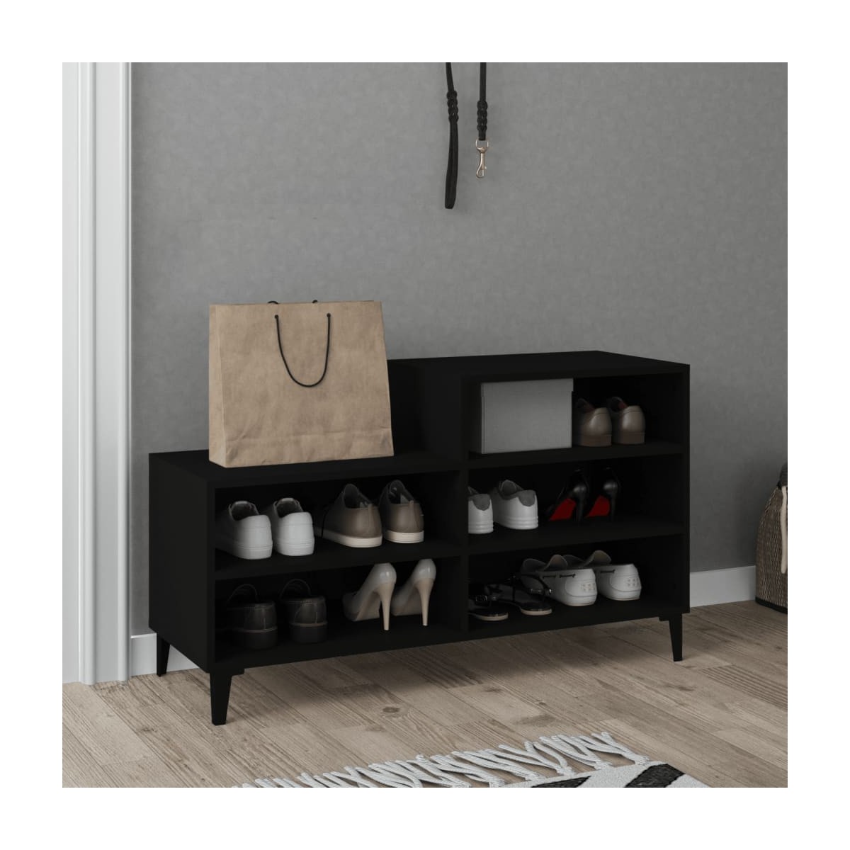 Con este compacto mueble zapatero, ¡nunca más te molestarán los zapatos desperdigados por toda la casa! Material práctico: Este zapatero está hecho de madera contrachapada. La madera contrachapada tiene una calidad excepcional, con una superficie lisa y también con fuerza, estabilidad y resistencia a la humedad.Amplio almacenaje: Con 5 estantes, este zapatero tiene capacidad para zapatos, cajas de almacenaje y otros artículos.Estructura estable: Las patas de metal dan un estilo industrial y tranquilo a la casa mientras garantizan su estabilidad.Superficie resistente: La robusta superficie del mueble zapatero es ideal para colocar objetos decorativos, marcos de fotos o plantas. También se puede usar como armario consola, alacena, etc. Advertencia:Para evitar el vuelco, este producto debe usarse con el dispositivo provisto para fijarlo a la pared. Nota:Cada producto viene con un manual de montaje en la caja para facilitar el montaje.