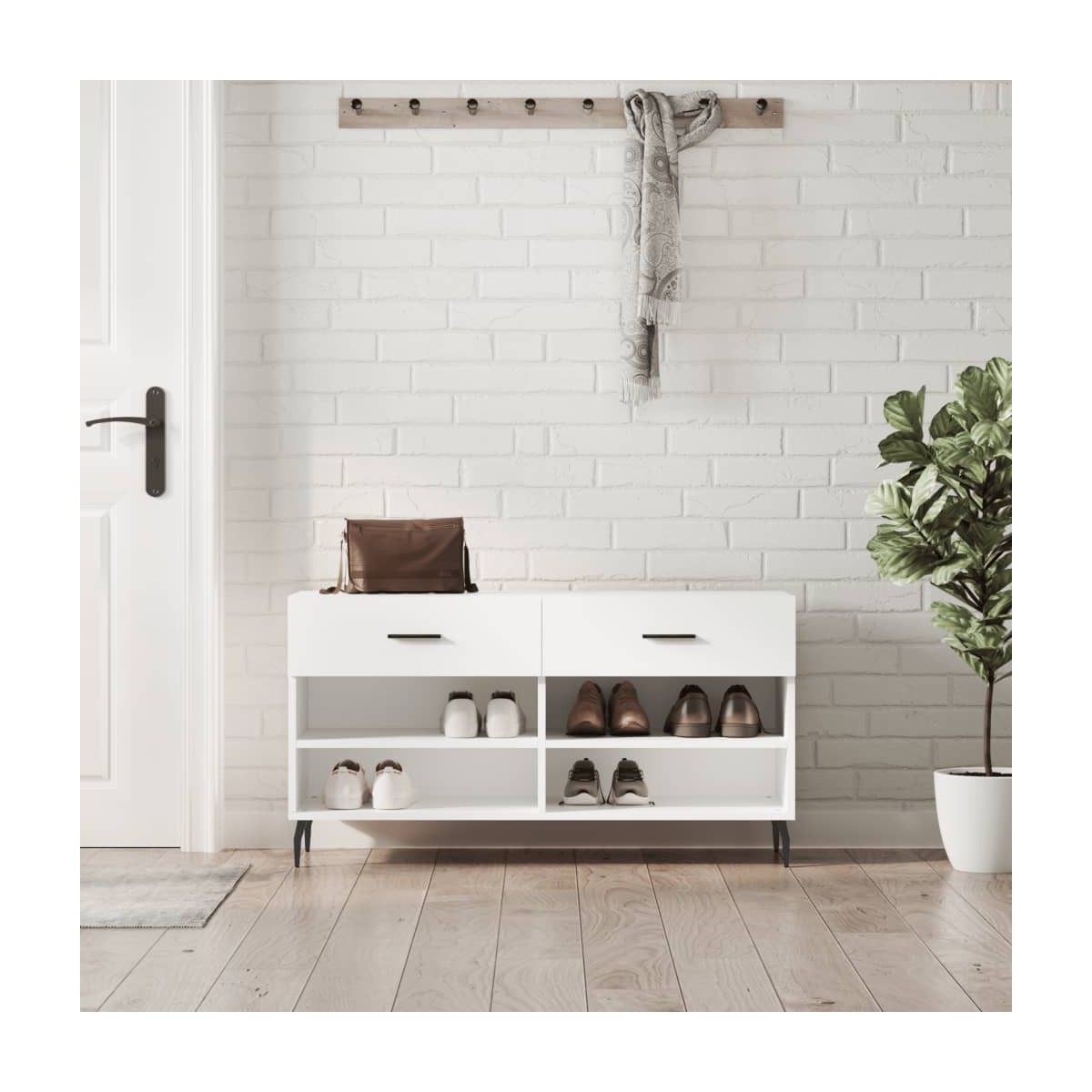 Guarda tus zapatos con este elegante y práctico banco zapatero. Es una opción perfecta para mantener ordenado el calzado. Material duradero: La madera contrachapada tiene una calidad excepcional, con una superficie lisa y también cuenta con fuerza, estabilidad y resistencia a la humedad.Amplio espacio de almacenaje: El banco zapatero tiene 2 cajones y 4 estantes que ofrecen un amplio espacio para los zapatos y otros objetos pequeños.Superficie robusta: La resistente superficie del mueble zapatero te permite sentarte cómodamente mientras te quitas o te pones los zapatos.Patas de hierro: Las patas de hierro dan un estilo industrial a la casa mientras garantizan su estabilidad. Advertencia:Para evitar que vuelque, este producto debe usarse con el dispositivo de fijación a la pared incluido.