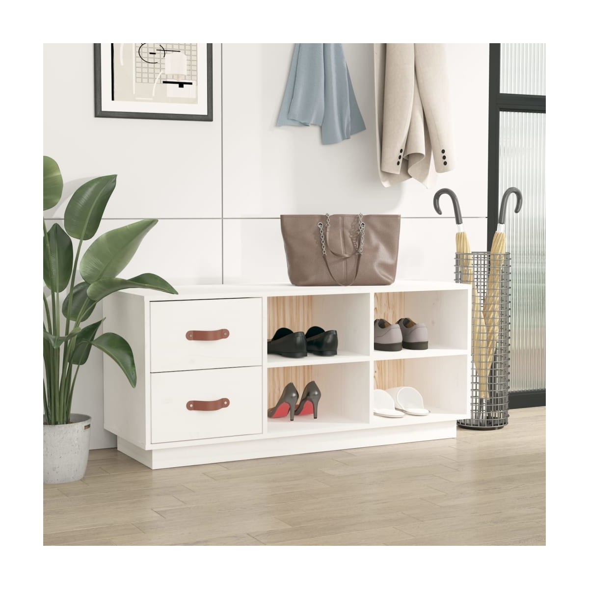 Este clásico banco zapatero de madera para la entrada es excepcionalmente bonito y puede hacer que la estancia esté más organizada. Madera de pino maciza: La madera de pino maciza es un bonito material natural. La madera de pino tiene vetas rectas, y los nudos dan al material su distintivo aspecto rústico. Estructura estable: La estructura de madera garantiza su solidez y estabilidad. Amplio espacio de almacenaje: Este zapatero tiene 2 cajones y 4 compartimentos, lo que te proporciona suficiente espacio para guardar tus zapatos a la perfección.Parte superior resistente: Puedes ponerte o quitarte los zapatos fácilmente mientras estás sentado en el banco zapatero en lugar de apoyarte contra la pared. También puedes colocar tu bolso y tus artículos decorativos favoritos encima. Nota:Cada producto viene con un manual de montaje en la caja para facilitar el montaje.