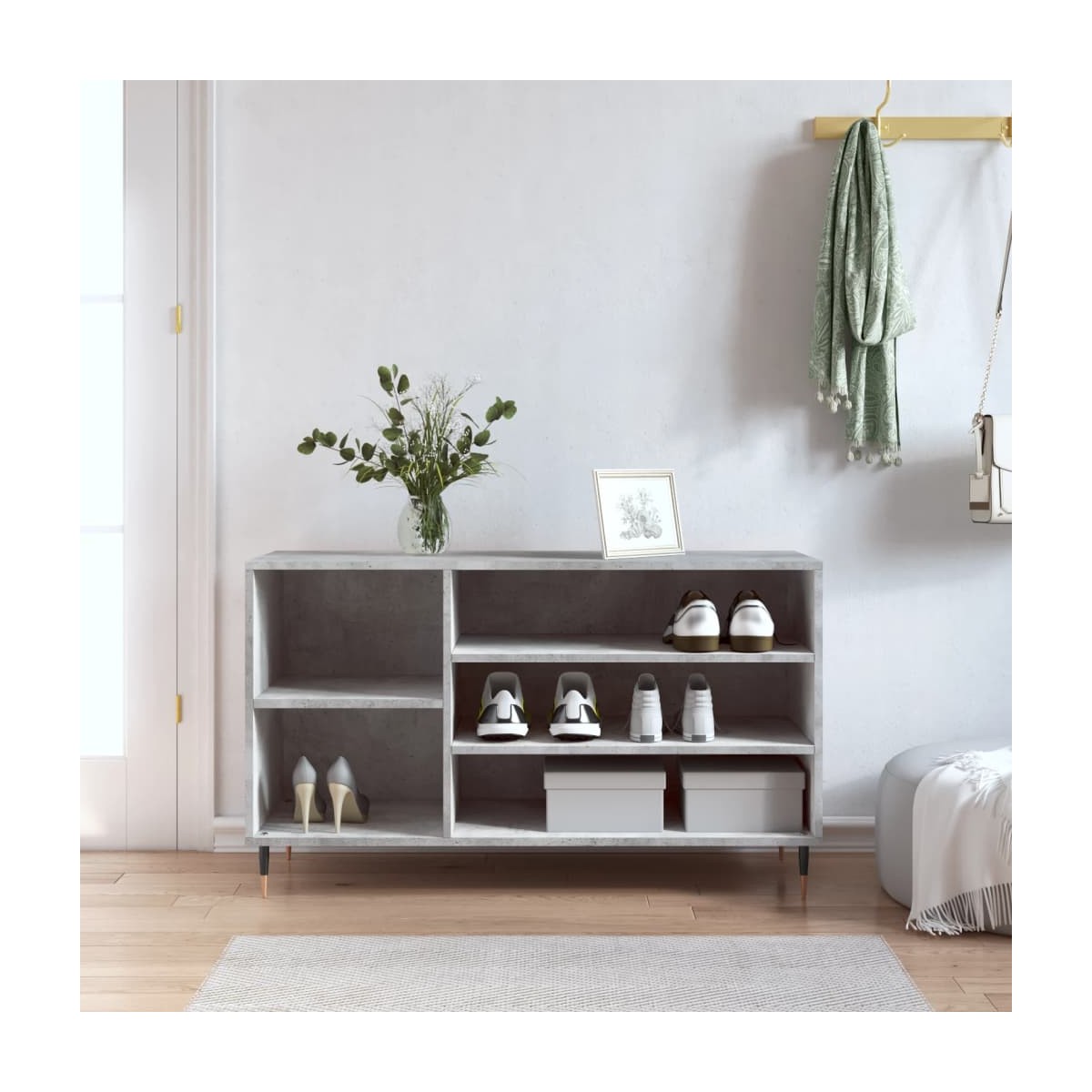 ¡Mantén los zapatos organizados y crea un ambiente ordenado con este elegante mueble zapatero! Material duradero: La madera contrachapada tiene una calidad excepcional, con una superficie lisa y también cuenta con fuerza, estabilidad y resistencia a la humedad. Hecho de madera contrachapada, el mueble zapatero es fácil de limpiar.Amplio espacio de almacenaje: El zapatero tiene 5 compartimentos, que proporcionan amplio espacio de almacenamiento para mantener los zapatos y otros objetos bien organizados.Superficie robusta: La superficie de este armario zapatero es ideal para colocar objetos decorativos, fotos o plantas.Patas de metal: Las patas de metal le dan un estilo moderno y tranquilo a la casa mientras garantizan su estabilidad. Advertencia:Para evitar que vuelque, este producto debe usarse con el dispositivo de fijación a la pared incluido.