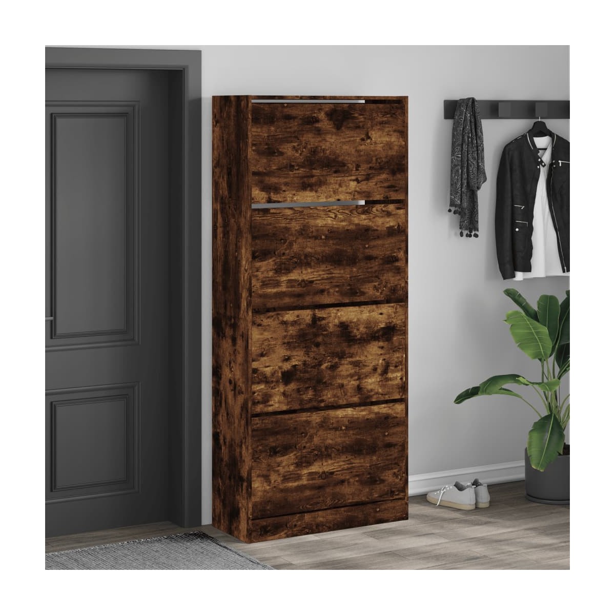 ¡Mantén tus zapatos bien organizados y siempre a mano con este zapatero! Material duradero: La madera de ingeniería tiene una calidad excepcional, con una superficie lisa y también cuenta con fuerza, estabilidad y resistencia a la humedad.Diseño que ahorra espacio: El zapatero hace un uso óptimo del espacio vertical y ocupa poco espacio en el suelo, lo que es especialmente adecuado para habitaciones pequeñas.Amplio espacio de almacenamiento: El zapatero cuenta con cajones abatibles que mantienen tus zapatos invisibles para ofrecer una estancia limpia y ordenada.Diseño moderno: El zapatero presenta líneas limpias y un aspecto minimalista que agrega un toque moderno a tu decoración existente. Advertencia:Para evitar que vuelque, este producto debe usarse con el dispositivo de fijación a la pared incluido. Información útil:Los tornillos y los tacos para el interior de la pared no están incluidos. Recomendamos encontrar y utilizar tornillos y tacos adecuados específicamente para las paredes. Si no estás seguro, puedes consultar con un profesional. Lee y sigue cada paso de las instrucciones.