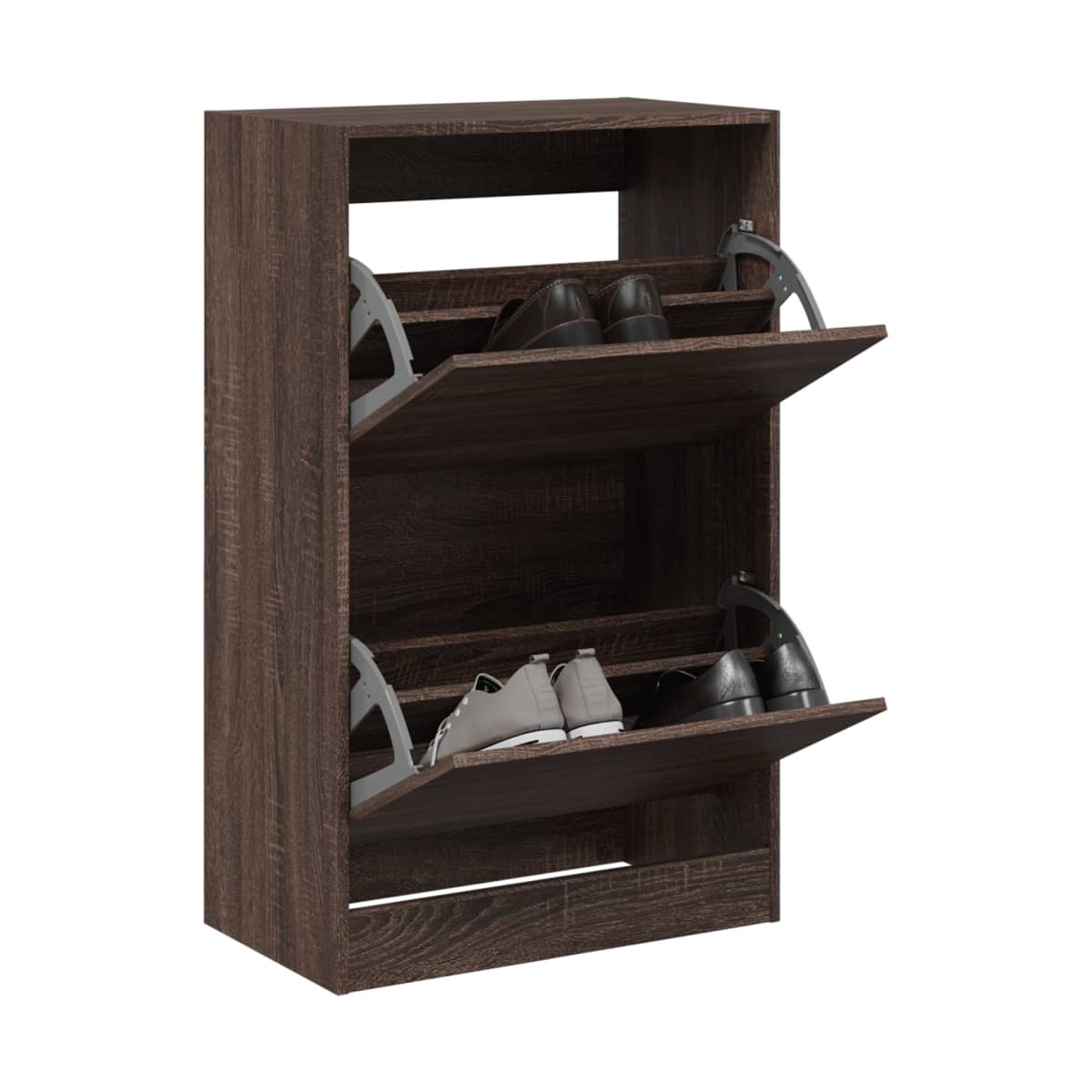 Este mueble zapatero es una excelente opción para guardar los zapatos de forma organizada, especialmente en espacios reducidos y estrechos gracias a su diseño compacto. Material duradero: La madera contrachapada tiene una calidad excepcional, con una superficie lisa, y también cuenta con fuerza, estabilidad y resistencia a la humedad.Amplio espacio de almacenaje: Esta estantería para zapatos cuenta con 2 cajones abatibles con 2 capas, que proporcionan un amplio espacio de almacenamiento para mantener el calzado organizado y al alcance.Superficie práctica: La superficie robusta de este armario zapatero es ideal para colocar objetos decorativos, fotos o plantas.Diseño que ahorra espacio: El armario de almacenamiento de zapatos delgado está diseñado para adaptarse perfectamente a espacios pequeños como entrada, pasillo, guardarropa, etc. Advertencia:Para evitar que vuelque, este producto debe usarse con el dispositivo de fijación a la pared suministrado.