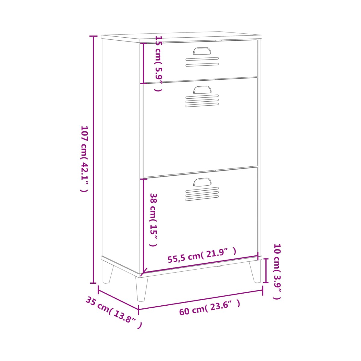 - Dimensiones exteriores del cajón: 55,5 x 15/38 cm (ancho x alto)